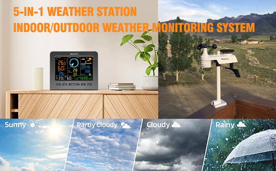 - ЧІТКИЙ 6,0-ДЮЙМОВИЙ КОЛЬОРОВИЙ ДИСПЛЕЙ: усі поточні дані про погоду можна переглядати на приголомшливому кольоровому РК-дисплеї. , яку зручно розмістити на полиці або закріпити на стіні. Дисплей погоди відстежує поточну погоду та умови навколишнього середовища, може прогнозувати погодні умови на наступні 24~48 годин або попереджати про різні екстремальні чи важливі погодні явища, наприклад, коли зовнішня температура занадто висока або занадто низька.