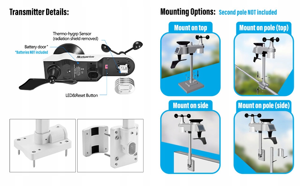 - ДАТЧИК ПОГОДИ 5 В 1: мрія кожного любителя погоди! Компактний і приємний на дотик пристрій містить анемометр, флюгер, опадомір, термометр і гігрометр - все в одному. Відстань бездротової передачі становить приблизно 300 футів/100 м у вільному місці. Основним джерелом живлення датчика є сонячна панель, а резервною батареєю є 3 батареї ААА (не входять у комплект).