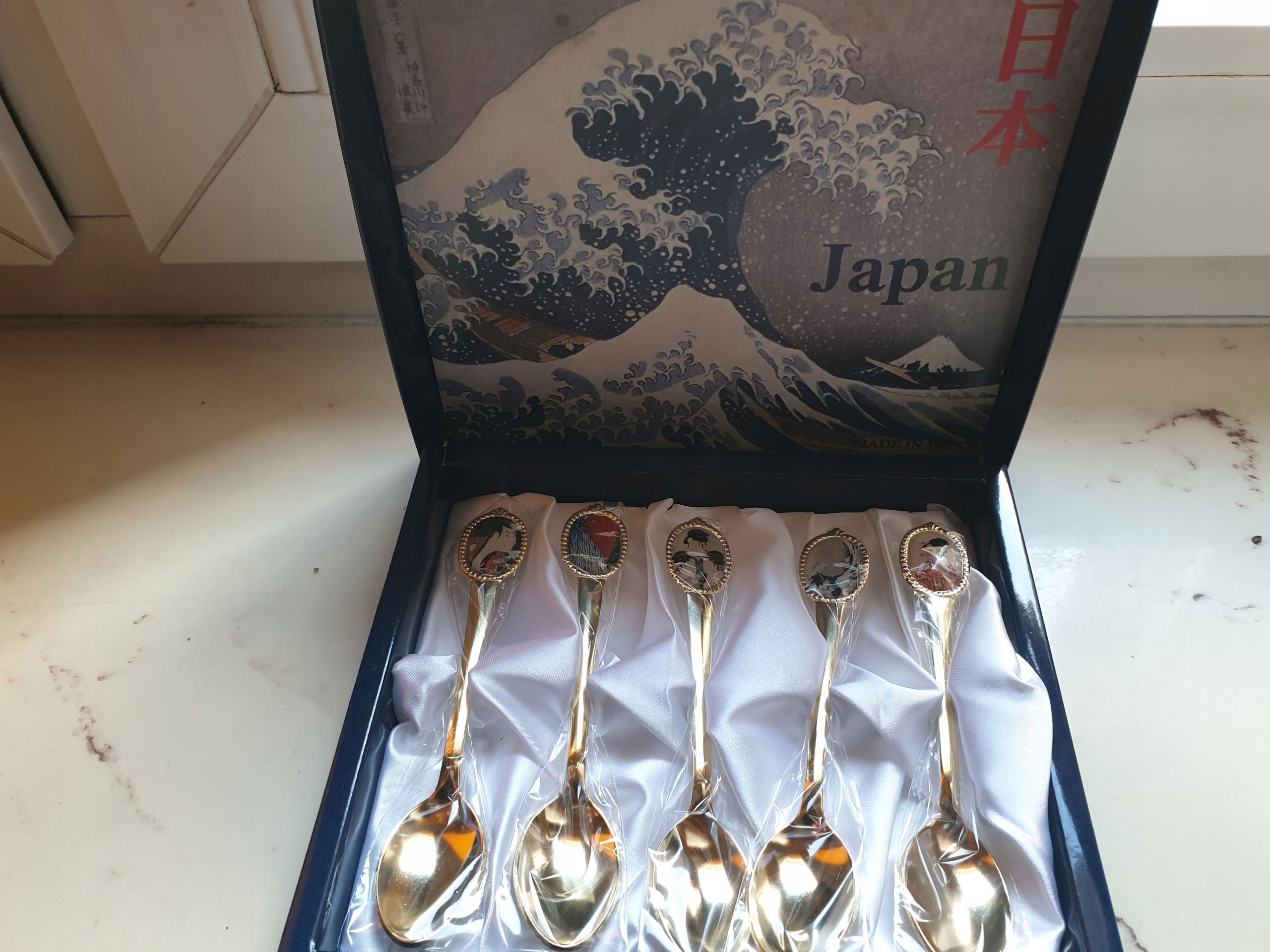 Тема пропозиції-це набір із п’яти унікальних, золотих чайних ложок з мініатюрами найбільших творів майстрів стилю ukiyo-e (浮世絵; "зображення (и) плаваючого світу"). Вони були імпортовані з Японії, товар, неможливий у Польщі. чайні ложки - нові, оригінальні, упаковані, вони ніколи не були відкриті. Ідеально підходить для подарунка!