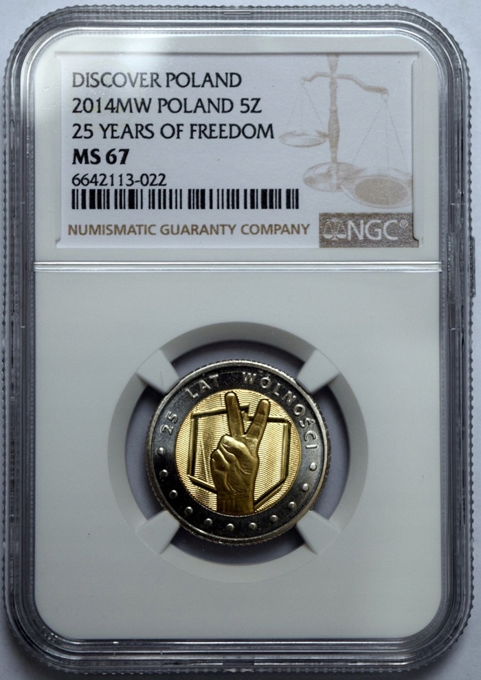 5 злотих 25 РОКІВ СВОБОДИ 2014 NGC MS67