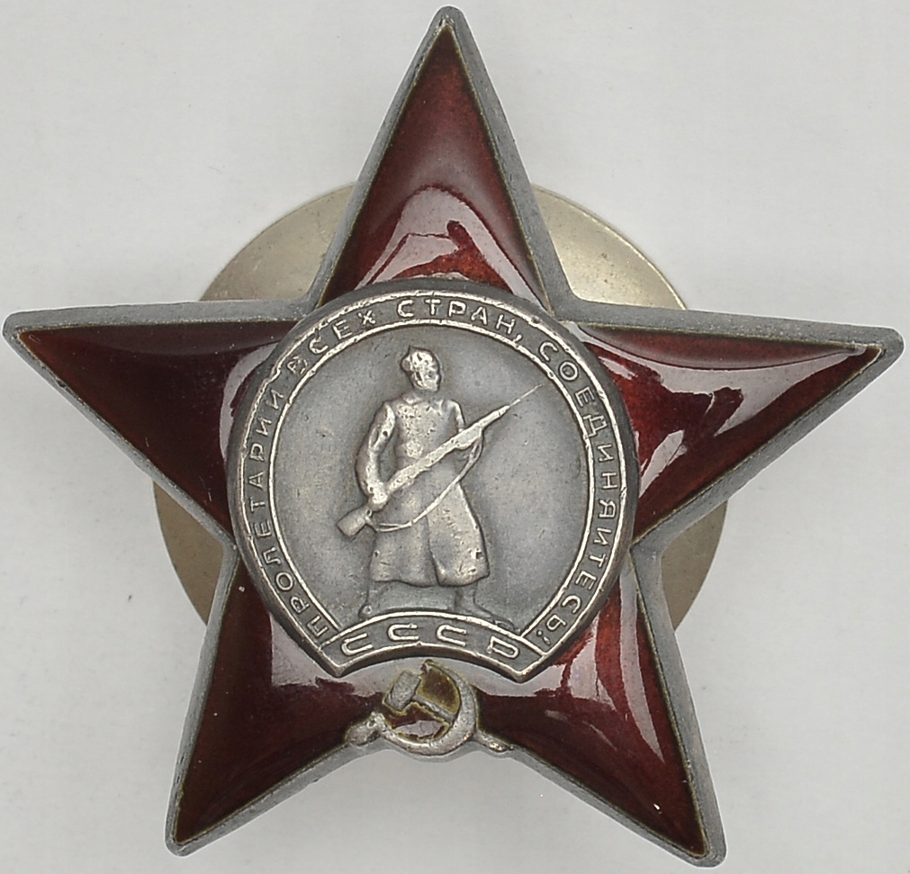 - Опис: Номер наказу: 1641817. Радянська бойова нагорода, заснована Постановою Президії ЦВК СРСР від 6 квітня 1930 року. Орденом Червоної Зірки нагороджено бойові заслуги в обороні СРСР і забезпеченні безпеки громадян як у воєнний, так і в мирний час.