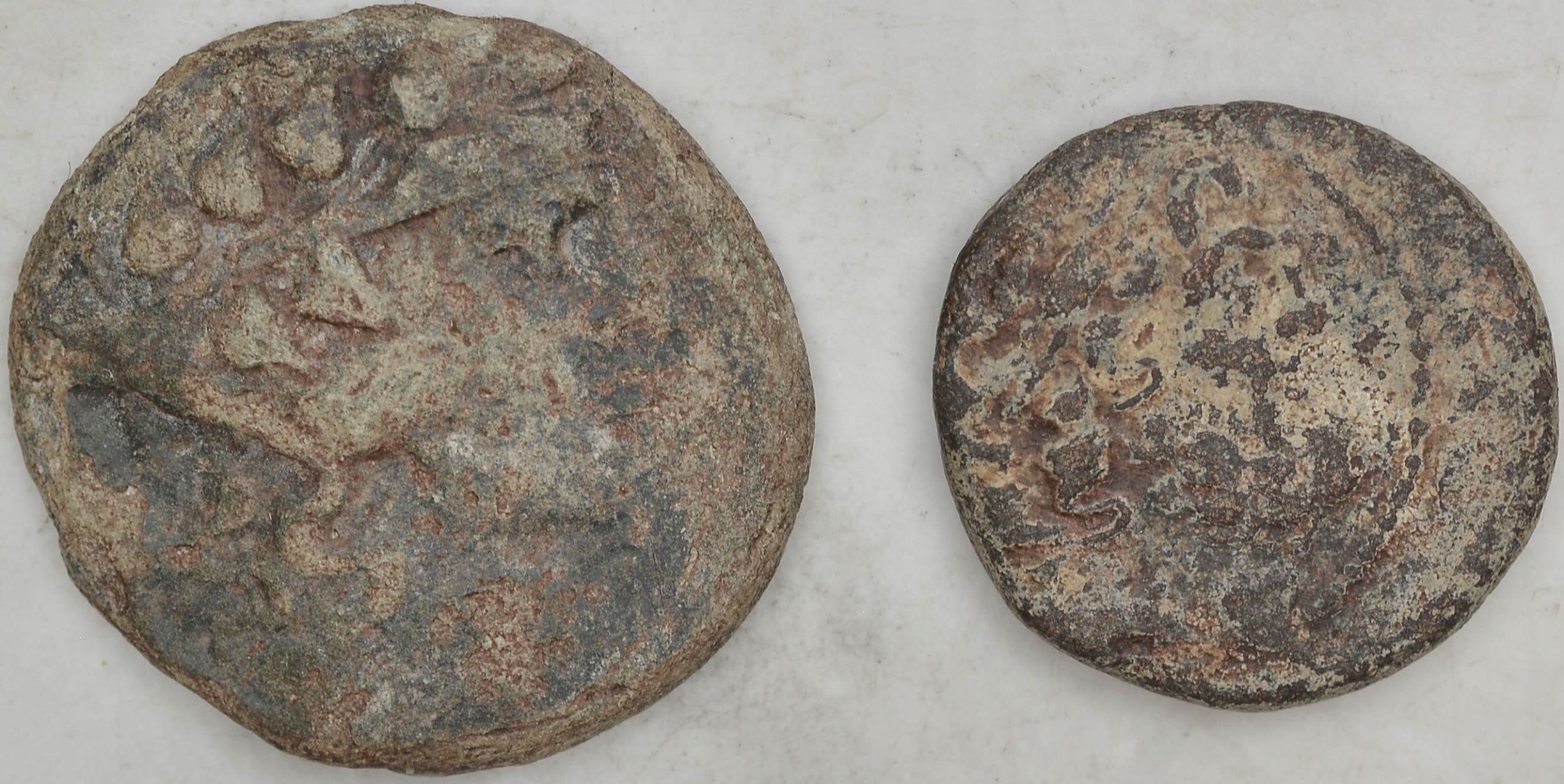 - Опис: У набір входять монети з номіналом: Селевкіди (?) - Бронза 323-63 до н.е. (діаметр приблизно 20 мм); Фракія, Маронея - Бронза 200-146 рр. до н (діаметр прибл. 26 мм). Корозія. Механічні пошкодження.