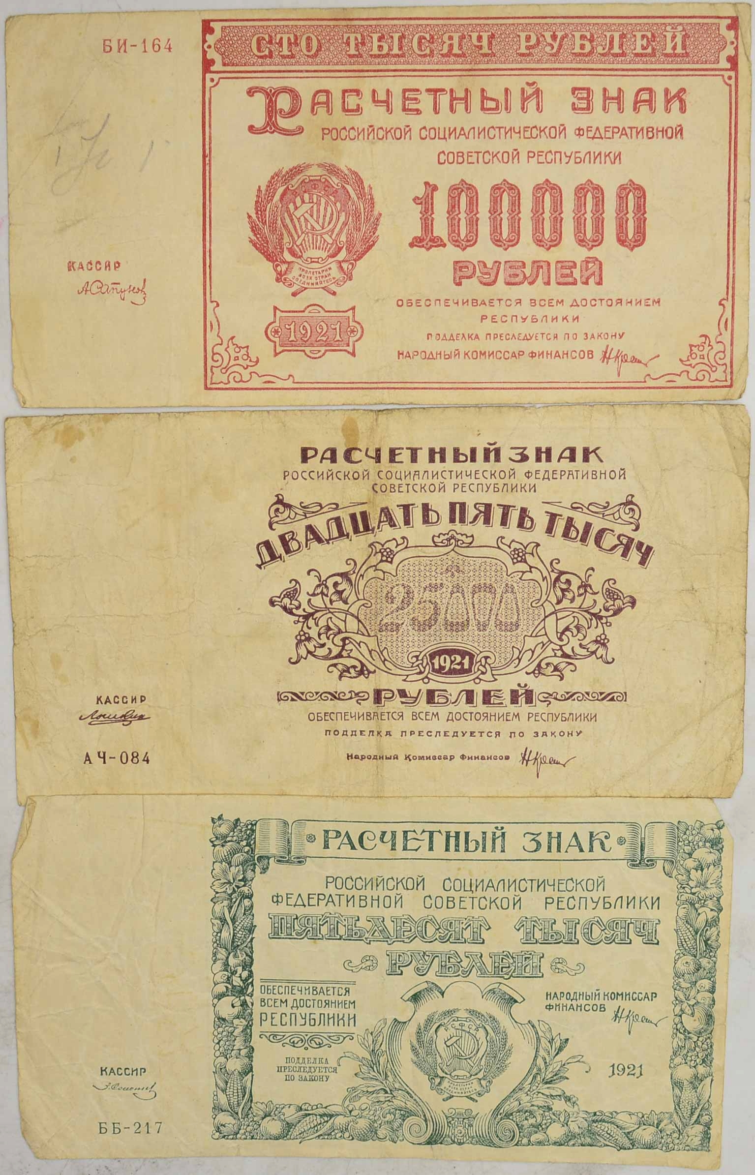 - Опис : У набір входять банкноти номіналом: 25 000 рублів, 50 000 рублів, 100 000 рублів - все з 1923 року. Водяні знаки: Великі зірки
