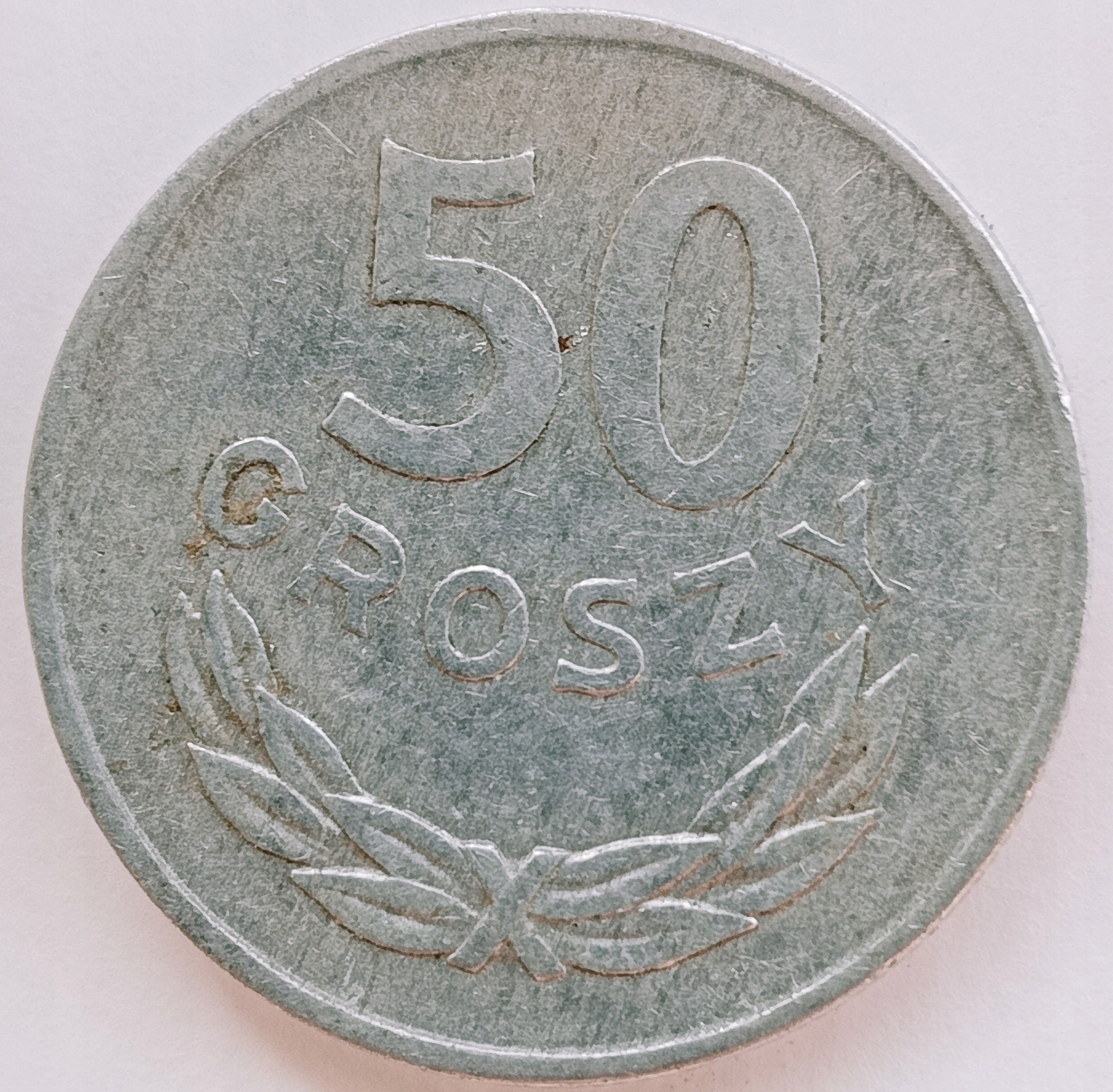 Аверс: значення: 50 GROSZYрозкритий вінок угоріЛегенда: немаєРеверс: емблемаЛегенда : ПОЛЬСЬКА НАРОДНА РЕСПУБЛІКАвнизу рік між крапками 1965 - 1985