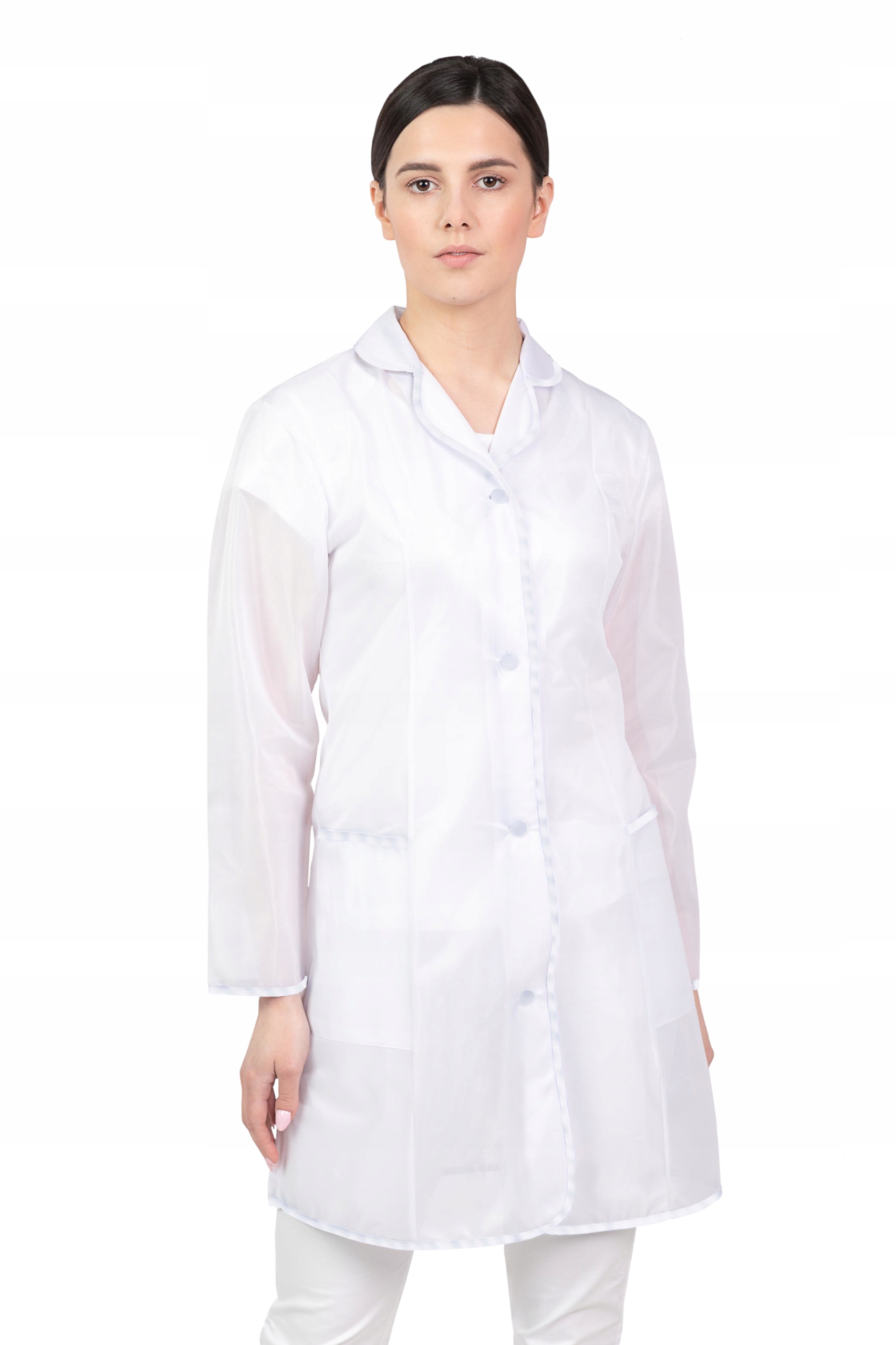Фартух захисний жіночий. З тканини 100% поліестер дедерон, довгий рукав, застібається на гудзики, декоративна біла обробка. Призначення: фартух призначений для людей, які працюють в таких галузях: харчова, громадське харчування, промисловість.