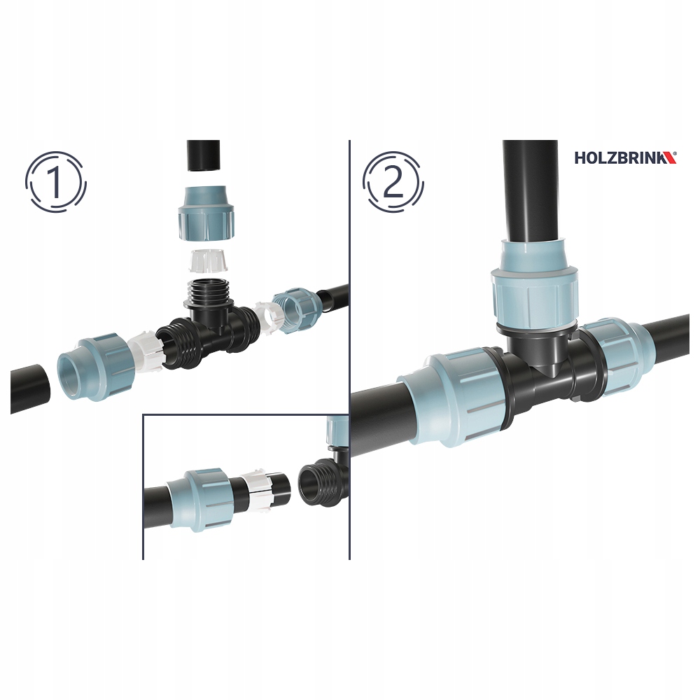 Найшвидший спосіб з’єднати трубу з фітингом – надіти на неї гайку і хомут (пластиковий хомут) і притиснути до кінця основної частини фітинга (приблизно 3,5 см). Потім потрібно перемістити хомут на край роз’єму і затягнути все це справа гайкою. Таким же чином можна приєднати до труби всі інші елементи, наприклад, трійники, коліна або заглушки.