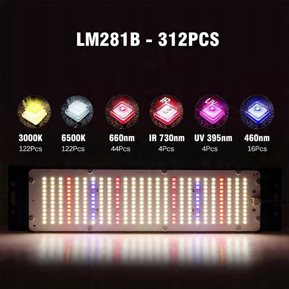 - Біле світлотеплоща 3000 K (122 шт.) + Біле світло 5000 K (122 PCS) + Червоне світло 660NM (44 PCS) + Синій світло (16 PCS.) + IR 730NM (4 PCS.) + UV 395