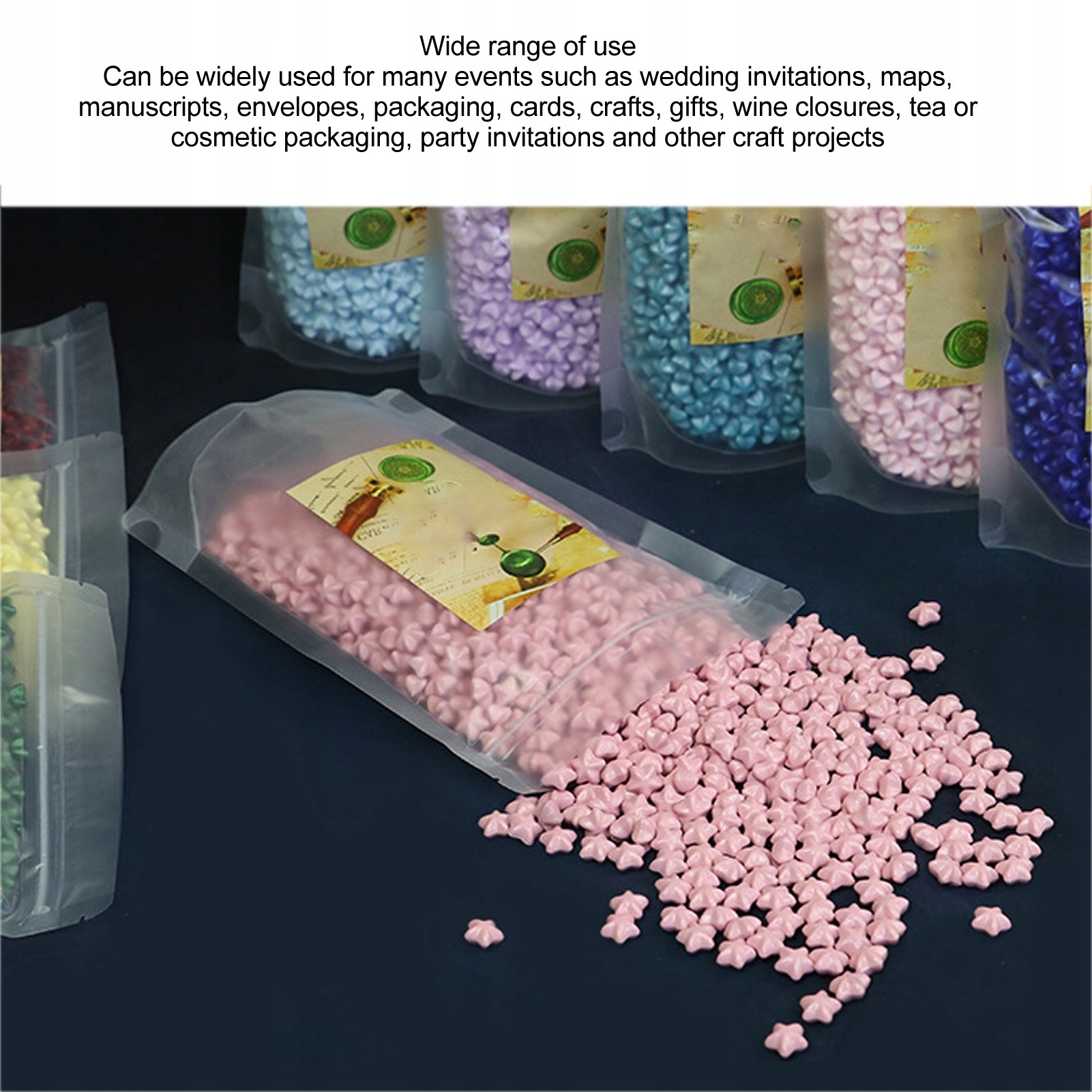 5. Широкий спектр використання: сургуч можна широко використовувати для багатьох видів діяльності, таких як запрошення на весілля, карти, рукописи, конверти, пакування, листівки, вироби, подарунки, упакування для вина, чаю чи косметики, запрошення на вечірки та інші ремісничі проекти.