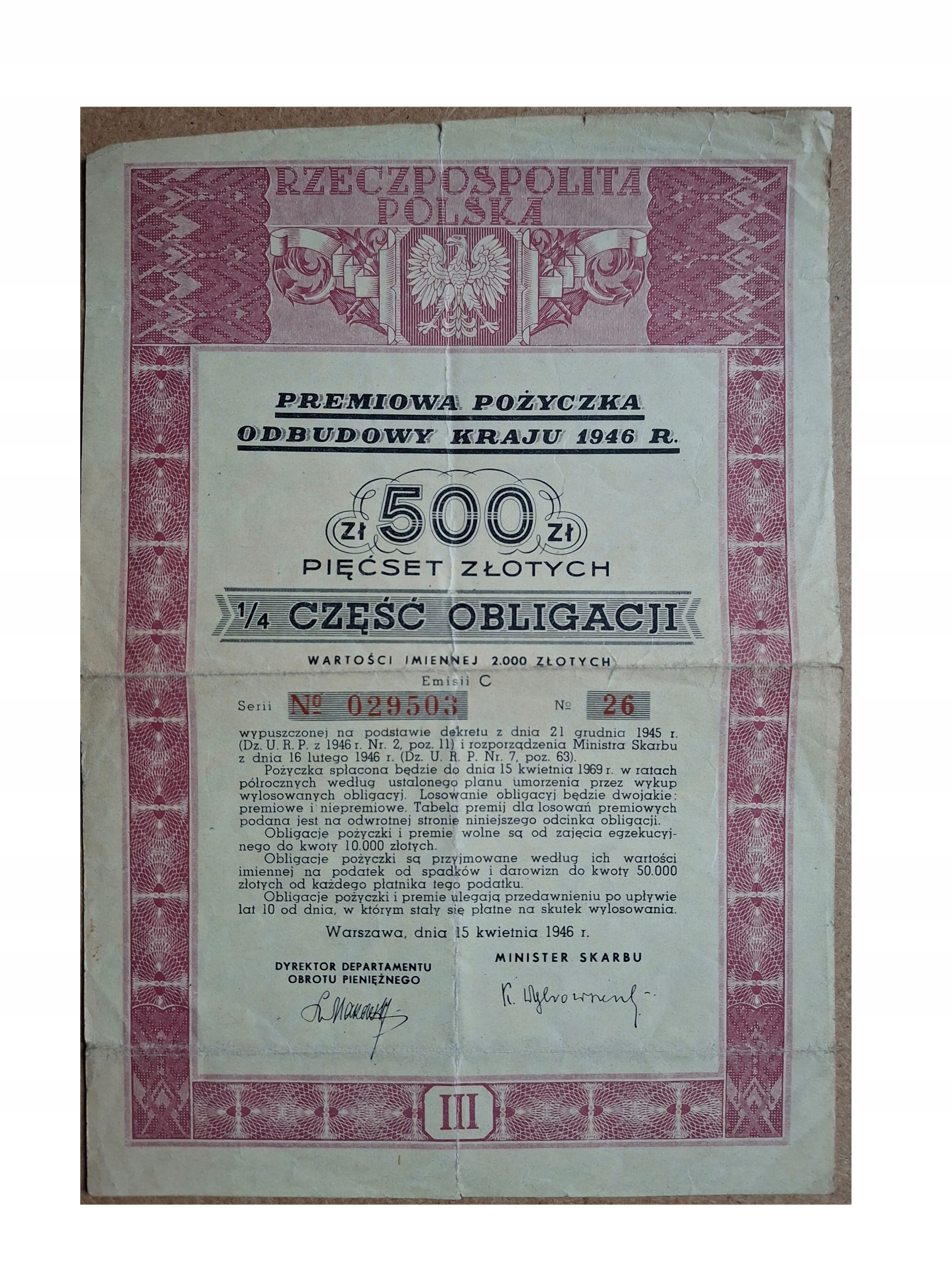 500 злотих - ЧАСТИНА ОБЛІГАЦІЙ - ПОЗИКА НА ВІДНОВУ КРАЇНИ 1946 р.