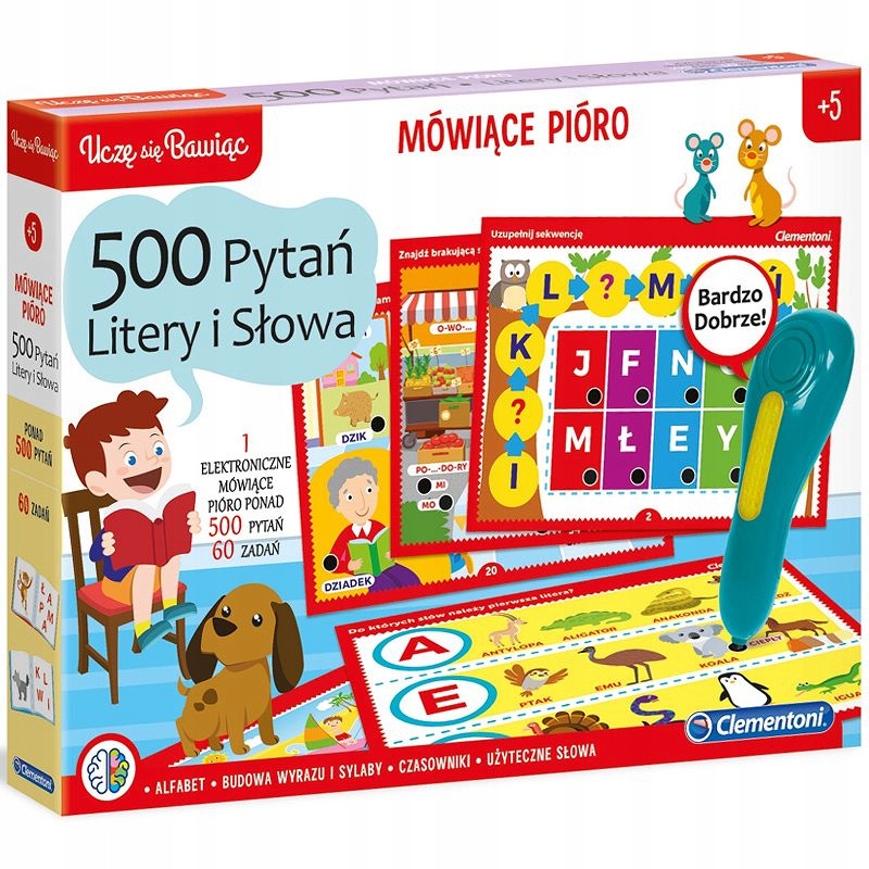 Talking Pen 500 Questions Letters and Words від Clementoni - розвиваюча гра у формі запитань і відповідей, в якій, крім карток із завданнями, у розпорядженні дитини є кумедна ручка, що говорить. Набір розроблений спеціально для дітей дошкільного віку від 5 років. Він містить багато навчальних завдань, які допоможуть вашій дитині через гру відкрити фантастичний світ букв, складів і слів. Граючись, малюк вивчить алфавіт і початкові літери, голосні і приголосні звуки, будову слів і складів, іменники (чоловічого, жіночого і середнього роду, а також однини і множини), прикметники, дієслова і корисні слова. У набір входить 60 завдань, які стосуються різних сфер і у веселій формі формують у дитини спостережливість, розвивають її логічні, мнемічні, лінгвістичні та мануальні навички. Розмовляюча ручка супроводжує дошкільника під час гри. Він направляє їх під час гри, дозволяючи йому навчатися самостійно. Ручка, вказуючи, чи правильна відповідь, видає повідомлення за допомогою світлових і звукових ефектів.