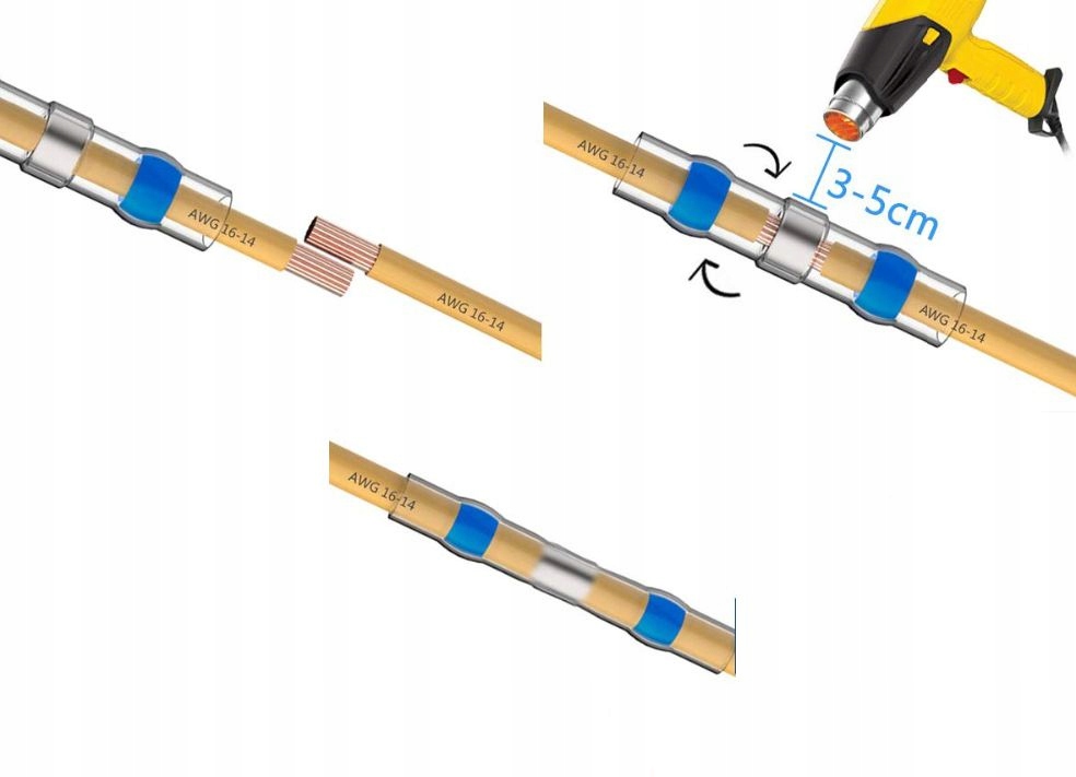 Завантажте близько 1 см ізоляції з кінця кабелів, перекладіть його через рукав, підключіть дроти між собою. Перемістіть рукав до з'єднання кабелів. Нагрійте рукав, поки не затягнешся на проводах. Зачекайте, поки роз'єм охолоне.