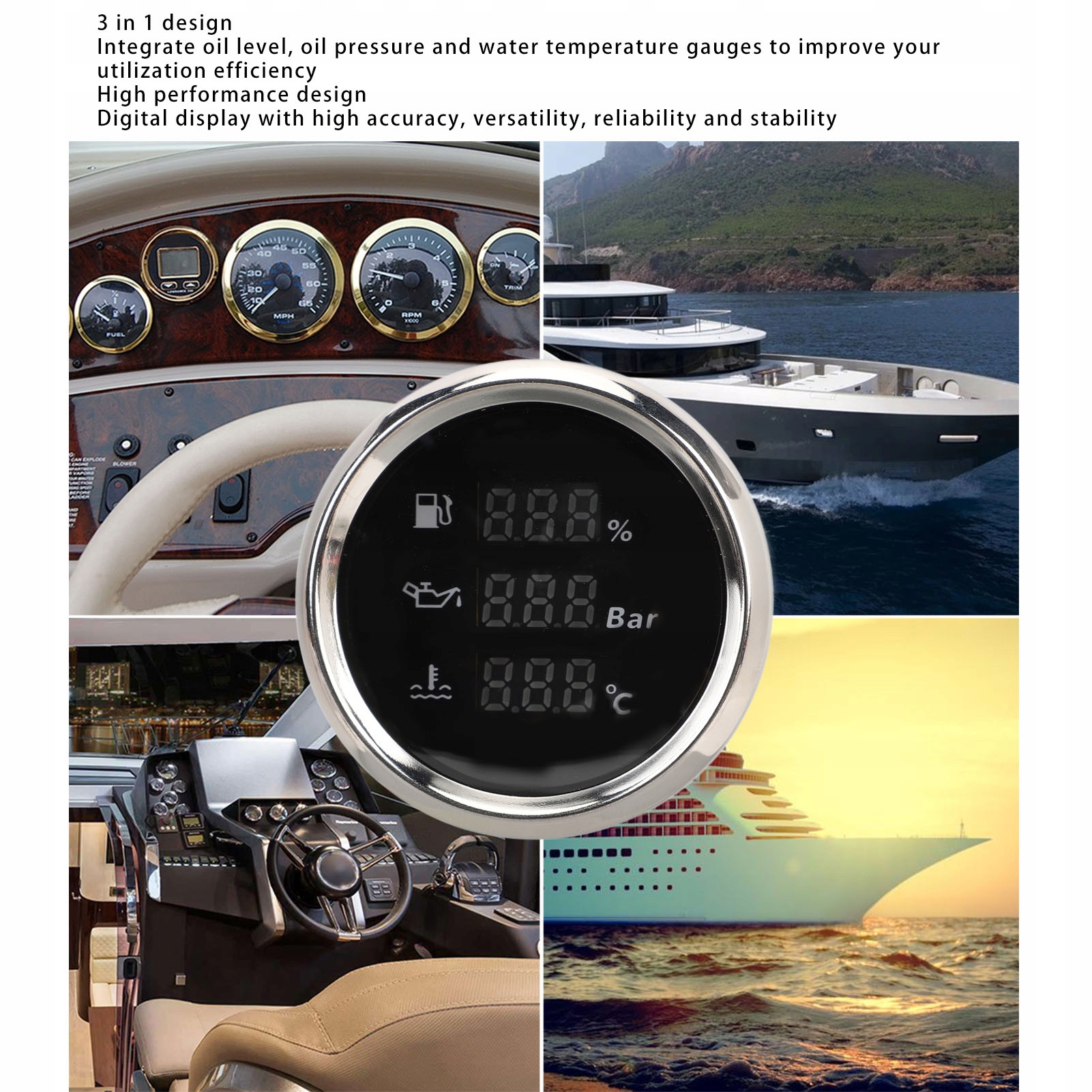 2. Будівництво 3 на 1: Отримайте інформацію про рівень масла, тиск масла та температуру води з одного індикатора, зменшуючи кількість пристроїв та заощаджуючи місце. Ідеально підходить для гілок, яхт, автомобілів для кемпінгу тощо