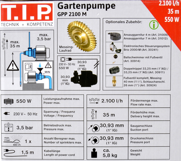 Садовий водяний насос GPP 2100M з міцним корпусом насоса, виготовленим із литого матеріалу, характеризується високою стійкістю до механічних пошкоджень, дуже тихою роботою та високою ефективністю з низьким енергоспоживанням.