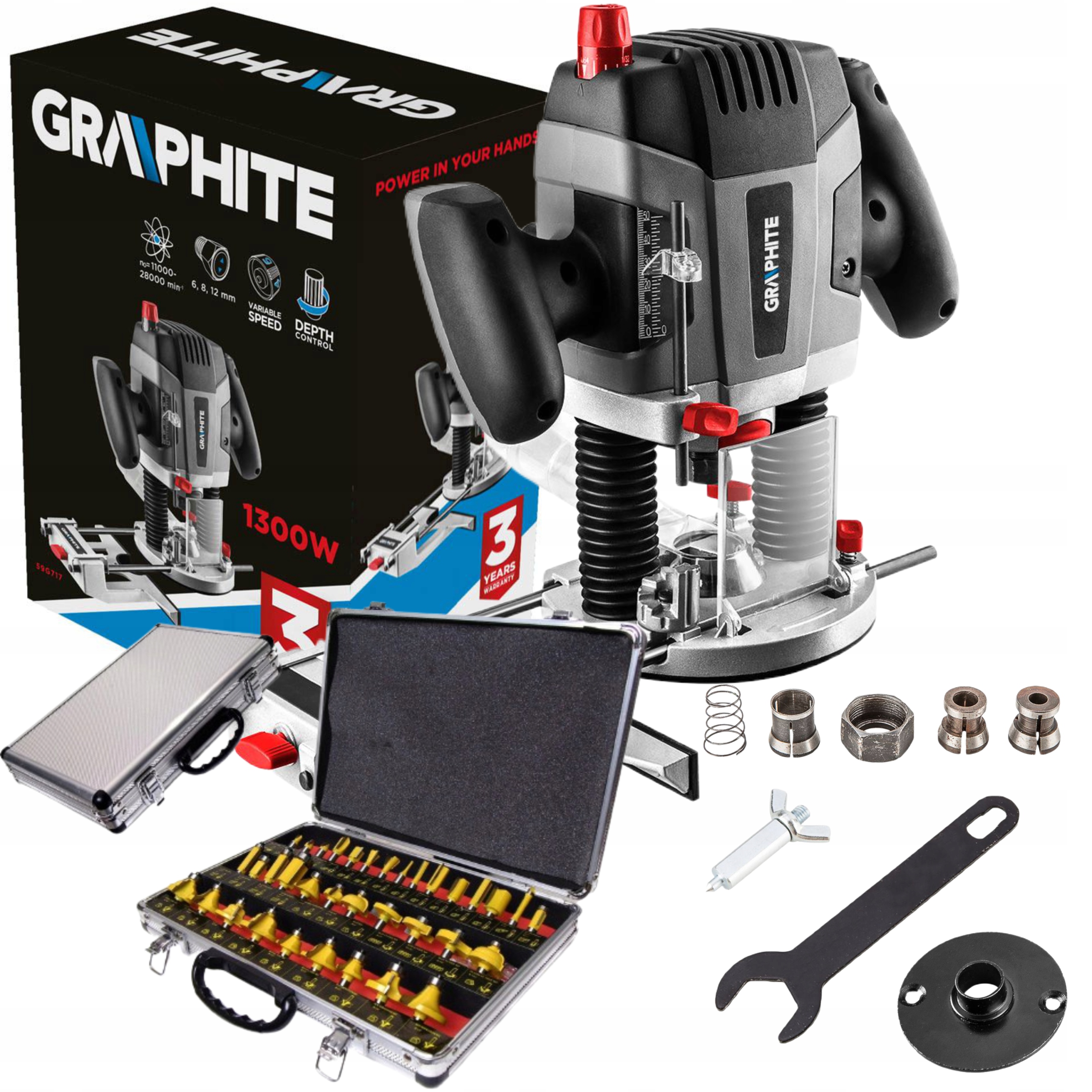 Фрезер GRAPHITE з ефективним двигуном потужністю 1300 Вт призначений для фрезерування отворів, пазів, країв і профілів у всіх типах дерев’яних і дерев’яних матеріалів, а також у пластмасі й алюмінії. Пристрій має функцію плавного регулювання швидкості і глибини фрезерування. Діапазон холостого ходу від 11 000 до 28 000 хв-1. Фрезерний верстат має блокування шпинделя і блокування глибини фрезерування. Глибину фрезерування можна регулювати за допомогою трьох пристроїв: 8-ступінчастого обмежувача глибини, обмежувача глибини з плавним налаштуванням (діапазон 0-55 мм) і ручки для точного регулювання глибини (точність 0,1 мм). Пристрій оснащений стійкою алюмінієвою ніжкою з пластиковою кришкою, що забезпечує легке наведення пристрою на будь-яких поверхнях. Направляючі двигуна фрезера вбудовані в алюмінієвий корпус з гніздами, які піддані спеціальній обробці поверхні, завдяки чому пристрій характеризується підвищеною точністю при опусканні. Ергономічні ручки фрезерного верстата покриті антиковзким матеріалом, що робить управління пристроєм комфортним і безпечним. Пилозахисний чохол і адаптер пиловідведення виготовлені з прозорого полікарбонату. Фрезерний верстат оснащений великою ручкою регулювання швидкості, яка розташована в межах досяжності великого пальця правої руки оператора. Поряд з лівою рукояткою фрезерного верстата розташований дугоподібний ергономічний важіль фіксатора направляючої корпусу, що дозволяє керувати ним, не відриваючи руки. У комплекті з фрезером є: ключ ріжковий, направляюча втулка для копіювання за шаблоном, вістря для фрезерування по колу, перехідник для відведення пилу з редукцією, три затискні втулки діаметрами 6, 8, 12 мм, алюмінієва паралельна напрямна, оснащена спеціальною кришкою з матеріалу, що захищає від подряпин, і механізмом, що дозволяє точно регулювати положення фрези щодо краю матеріалу.