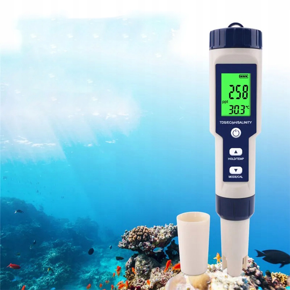 ✨обладнаний для вимірювання pH, TDS, EC, солоності (морської/прісної води) і температури в одному пристрої.