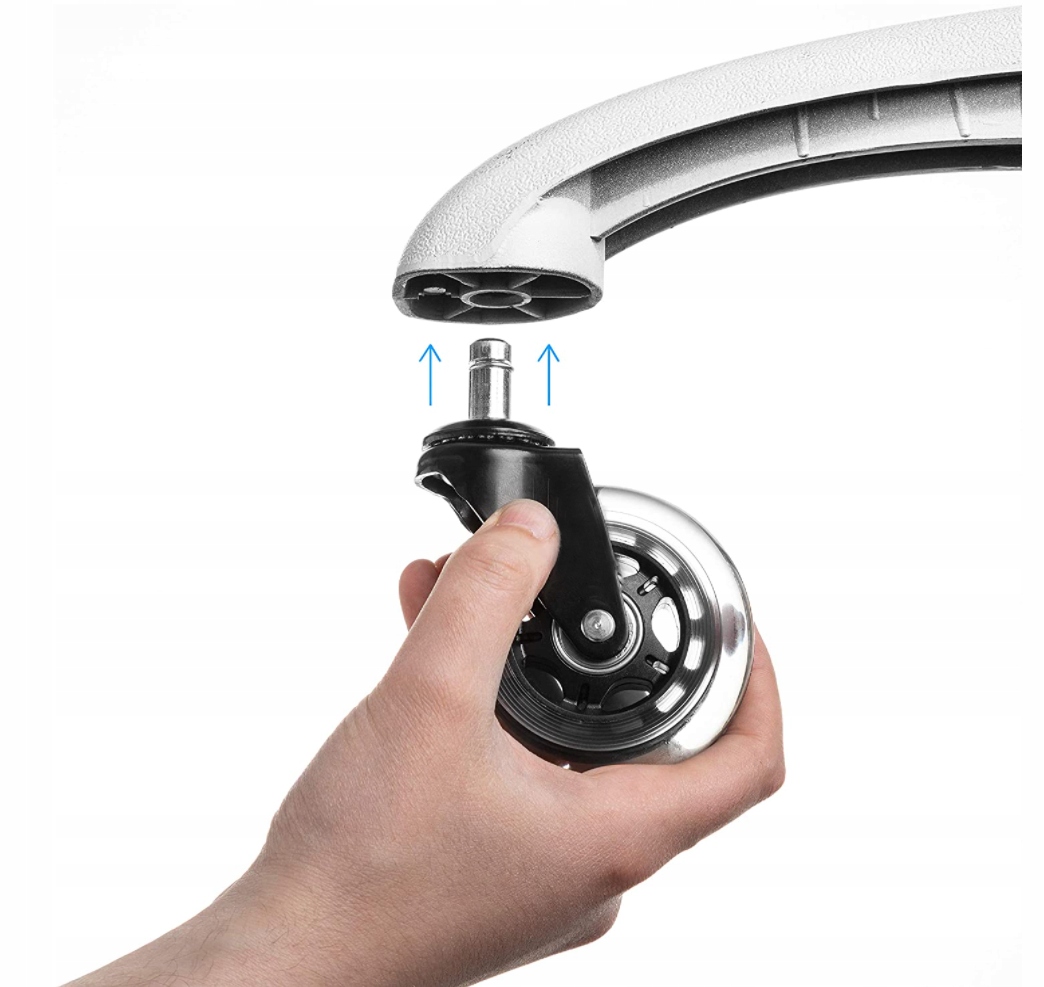 Просто зніміть старі колеса з основи стільця та втисніть у них шток нових коліс. Для його заміни не потрібні інструменти