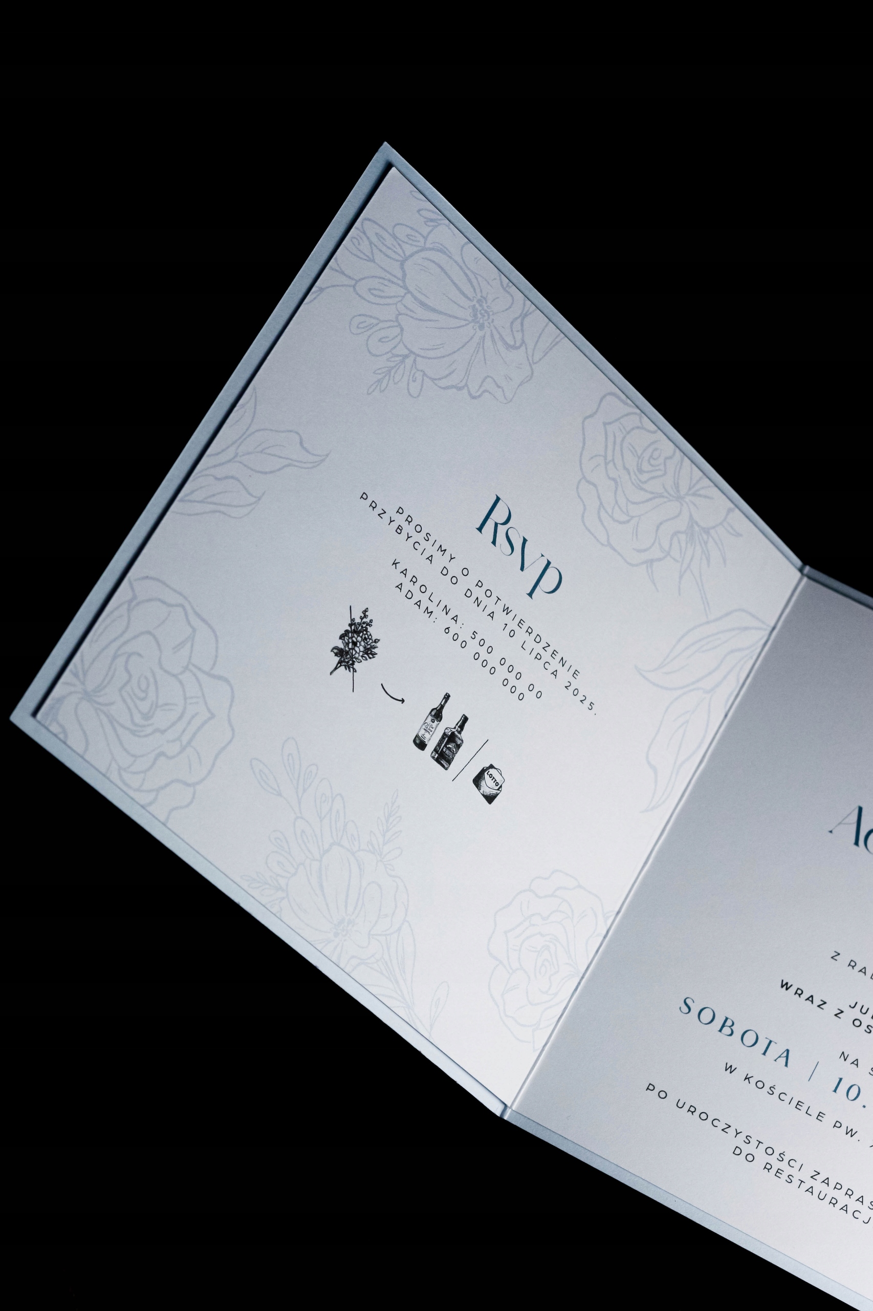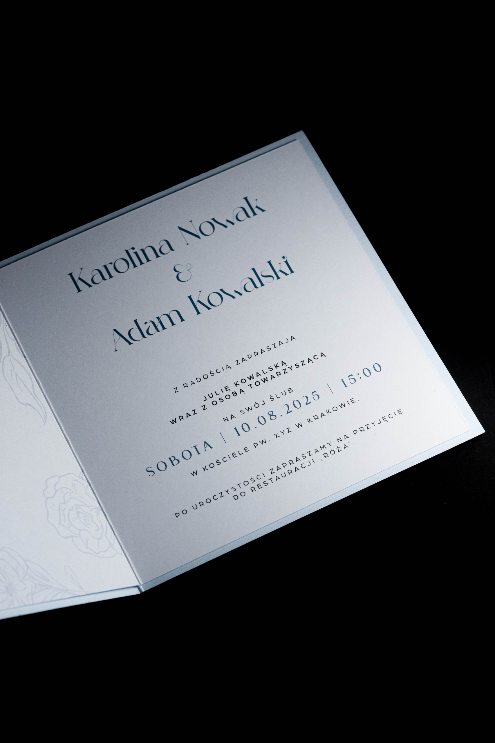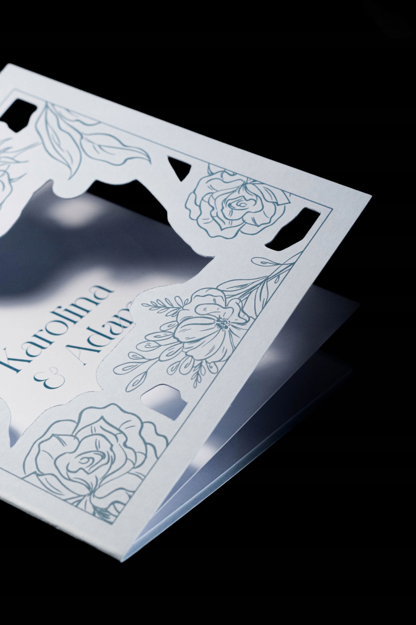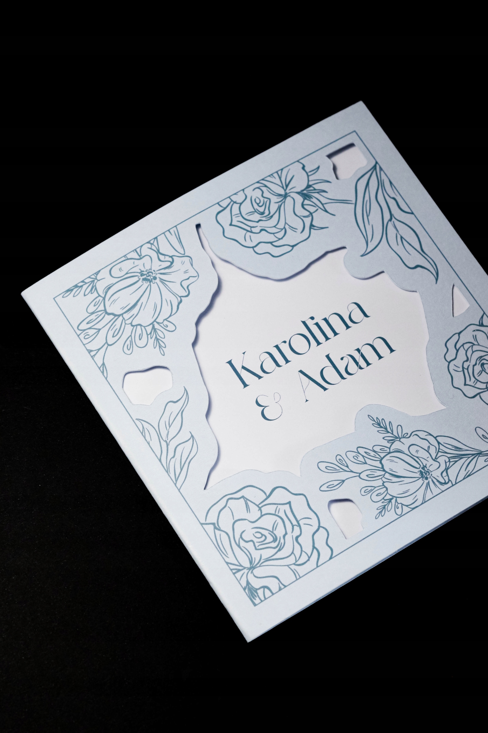 обкладинка, виготовлена з елегантного синього паперу з вирізанням квітів і листя, надаючи запрошення тонкий романтичний символ. Стиль: елегантний, романтичний, класичний
