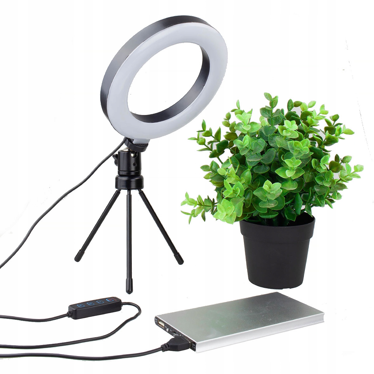 Функціональний кільцевий світильник діаметром 15,5 см, простий у використанні, регулюється як світловіддача, так і тепло: 10-рівневе регулювання потужності та 3-рівневе регулювання кольору. Його потужність становить 20 Вт, що ідеально підходить для підсвічування портретів, деталей макіяжу, продуктів, а також ідеально підходить для запису фільмів або живих відеодзвінків. Його можна встановити на аксесуари з різьбленням 1/4", включаючи тримач-жабу та міні-штатив, що входять до комплекту CG-100. Зручність використання лампи підвищує кабельний пульт дистанційного керування, який дозволяє вмикати та вимикати лампу, ступінчасто змінювати потужність та змінювати температуру в 3 діапазонах. Лампа з живленням від USB підвищує її мобільність та зручність у використанні - вона ідеальна для виходу на вулицю (з власним павербанком, ноутбук або інший блок живлення з входом).