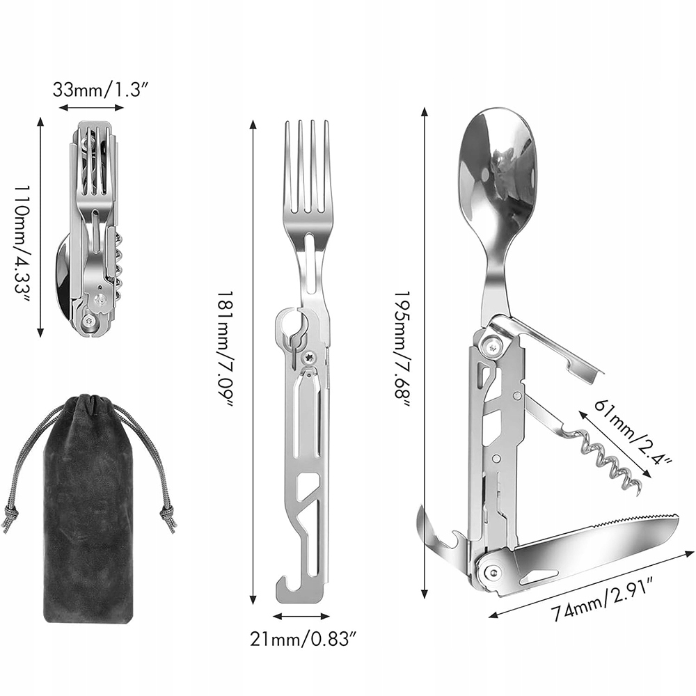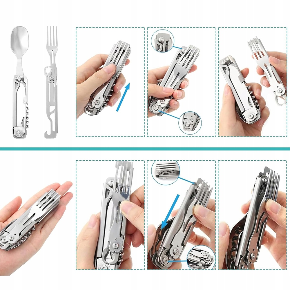 ✅【Знімний вилка】Часть вилки можна зняти та використовувати окремо. Після використання його можна скласти та встановити на багатофункціональний інструмент або відкрити безпосередньо для використання без розбирання. Ложка та ніж не знімаються.