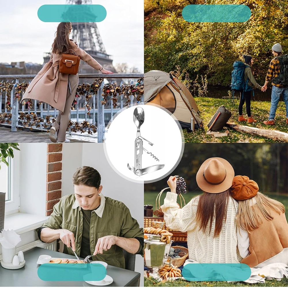 ✅【Багатофункціональний складаний столовий прилад 5 в 1】Включає ніж, виделку, ложку, відкривачку для пляшок вина та відкривачку для консервних/пляшок. Портативний багатофункціональний набір столових приборів для кемпінгу економить місце та його легше носити.