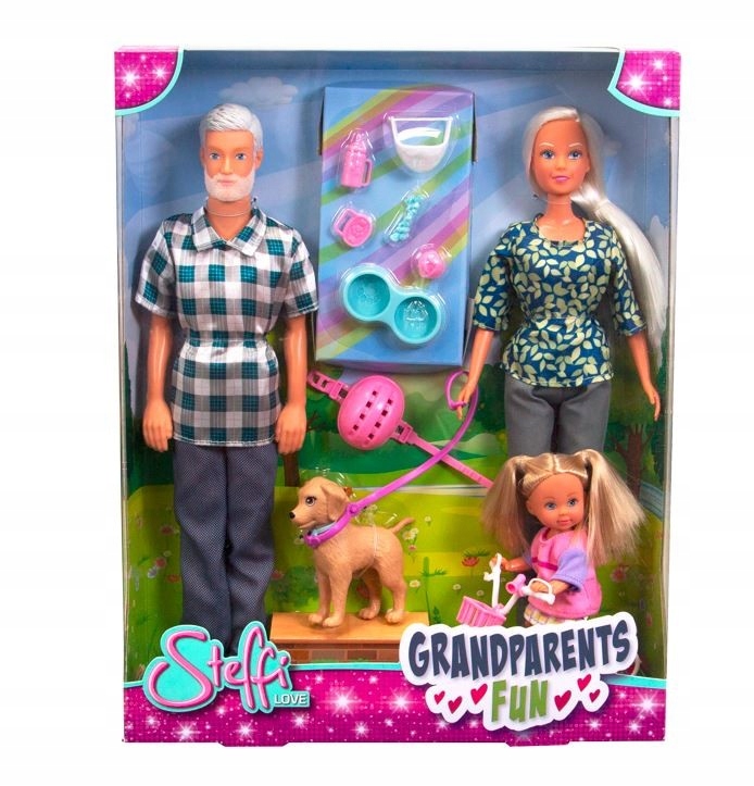 Бабуся та дідусь ведуть свою онуку Еві та собаку на прогулянку. У набір входять численні аксесуари, такі як велосипед для Еві, шолом і аксесуари для собаки: поводок, ємність для води та іграшка для собаки. Висота ляльки: 30 см, 29 см, Evi 12 см, 3л+