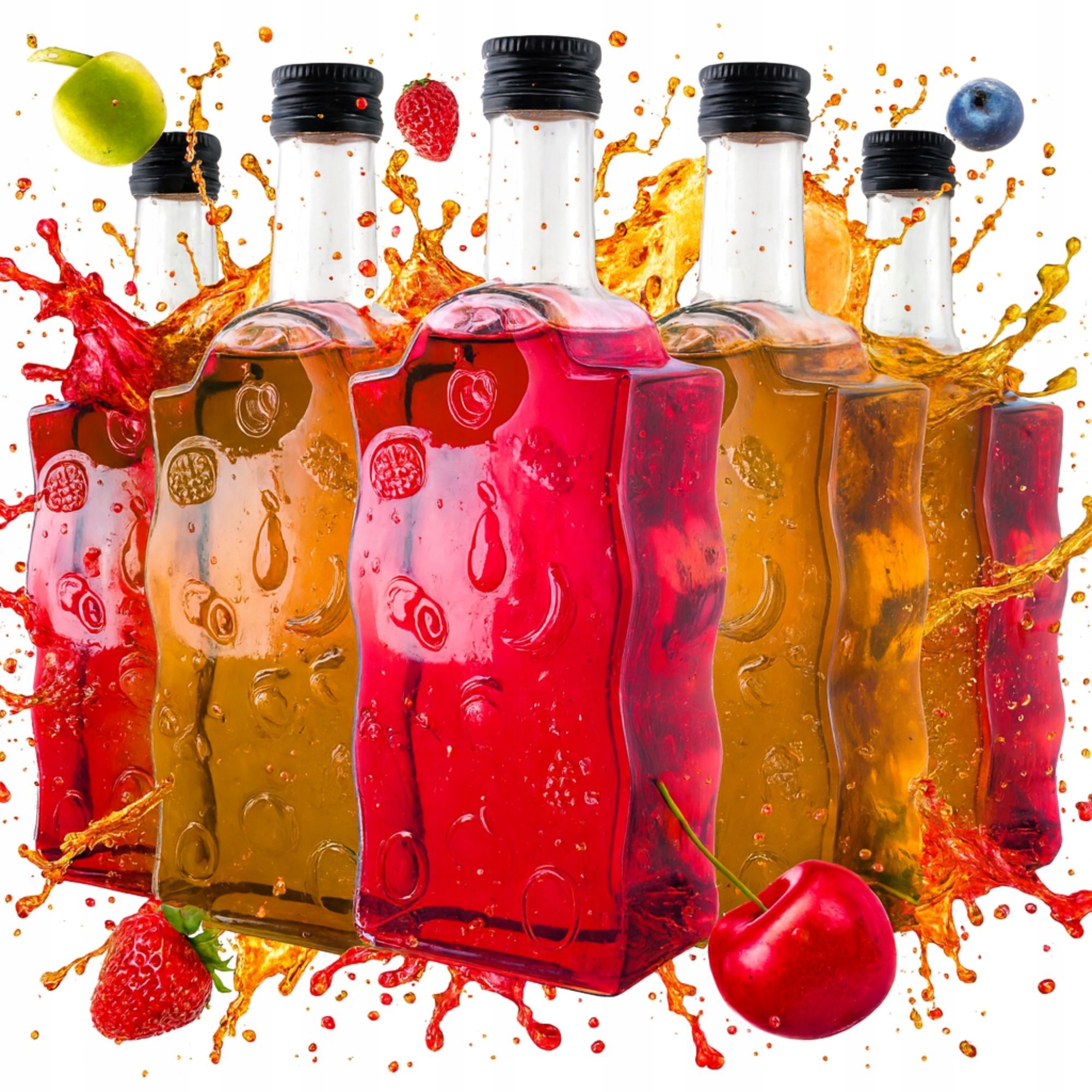 Набір із 5 пляшок Owocowy Grzech 500 ml - це унікальний келих, який спокушає своєю хвилястою формою та тисненням фруктів мотиви. Виготовлені з товстого безбарвного скла і закриті чорними кришками, вони ідеально підходять як пляшки для лікерів, самогону, вин, лікерів, соків або сиропів. Це набір, який поєднує функціональність із декоративним характером — чудовий як для домашнього льоху, так і для подарунка.