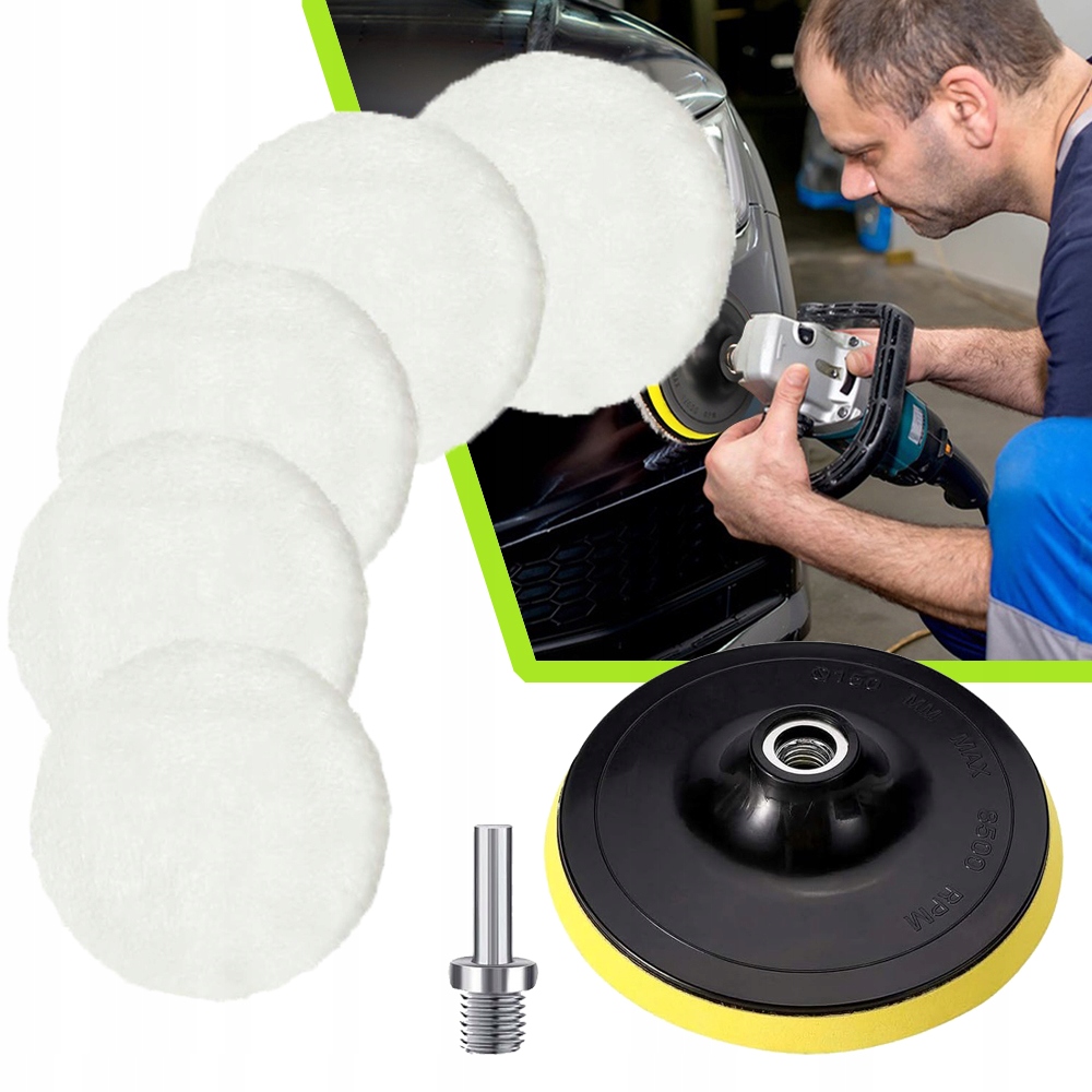 🎁🎁【Вміст упаковки】 Ви отримаєте 5 шт. вовняних полірувальних подушечок для полірування автомобіля, 1 клейку подушечку, 1 адаптер для дрилі; Сумісний із настільними дрилями, високошвидкісними кутовими шліфувальними машинами, полірувальними машинами, для усунення складних оксидних шарів, подряпин тощо на автомобілях, зручний для щоденного використання.