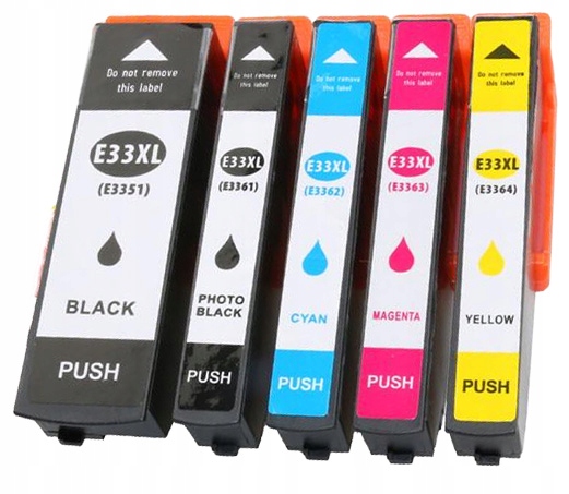 НАБІР З 5 ВИСОКОЕФЕКТИВНИХ ЗМІННИХ ЧОРНИЛ ДЛЯ ПРИНТЕРІВ EPSON T3351 - T3364 ЄМНОСТЮ XL, ОСНАЩЕНИХ НАЙНОВІШИМИ ЧІПАМИ - РОБОТА БЕЗ ПРОБЛЕМ - ПРОСТО ВСТАВТЕ ТА ДРУКУЙТЕ.