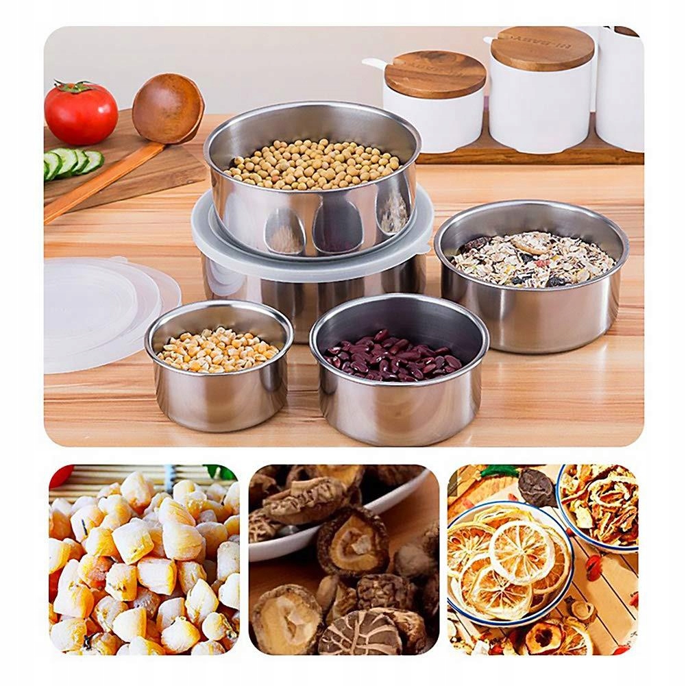 Набір з п'яти мисок з високоякісної нержавіючої сталі з комплектом кришок. Кожна миска оснащена кришкою, яка збереже їжу свіжою протягом тривалого часу.