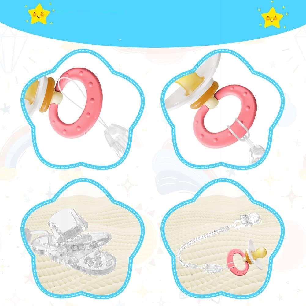 Набір із 5 ланцюжків/шнурів для соски та прорізувача, ідеально підходить для немовлят, створений для безпеки та комфорту немовлят та спокою розуму батьків на увазі. Ці практичні аксесуари допомагають запобігти втраті пустушки чи прорізувача, тримаючи їх завжди під рукою вашої дитини.