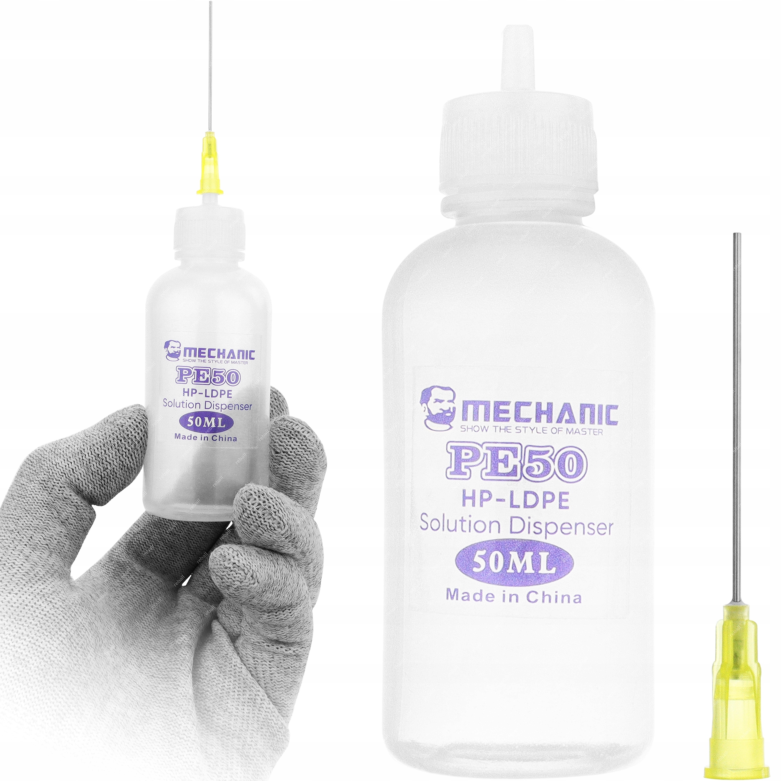 Mechanic PE50 dispensing bottle - це ємність, виготовлена з високоякісного поліетилену низької щільності (LDPE), який є гнучким і стійким до механічних пошкоджень і багато хімічних речовин, таких як кислоти, етанол, ацетон.