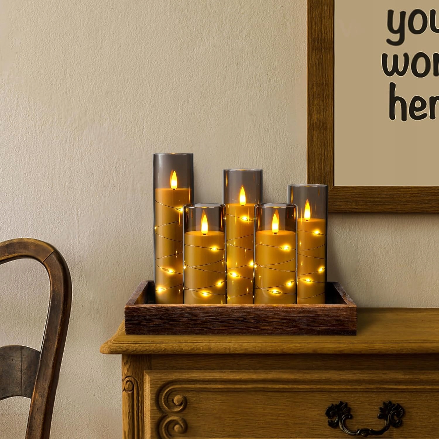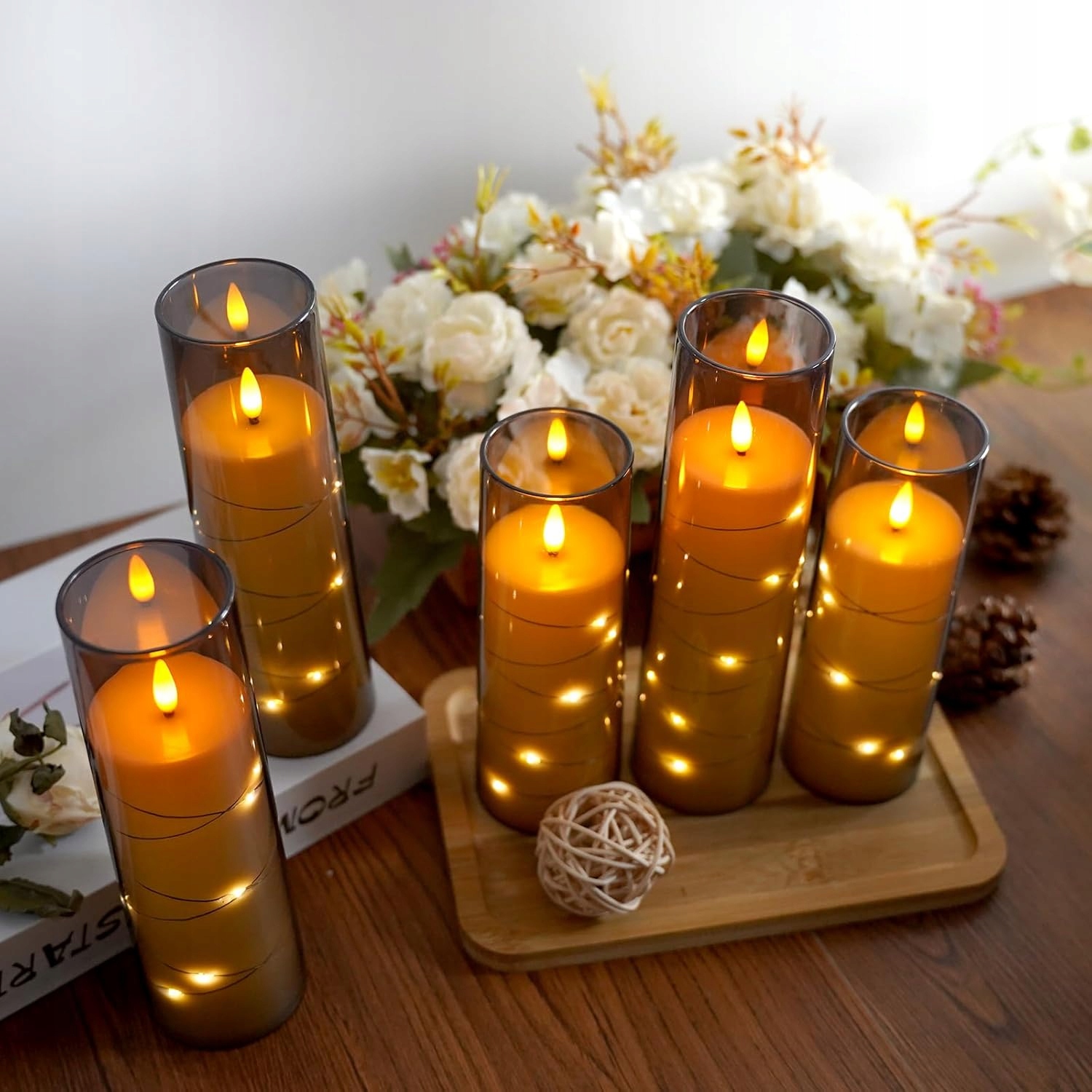 ◾Цей набір включає 5 красивих безполум’яних свічок у поєднанні з дистанційним керуванням і чарівним ефектом зоряного неба, щоб ви могли насолоджуватися унікальною атмосферою освітлення. Свічки на батарейках ідеально підходять для сучасного життя, вони імітують тепле світіння справжніх свічок без ризику спалаху та опіків.