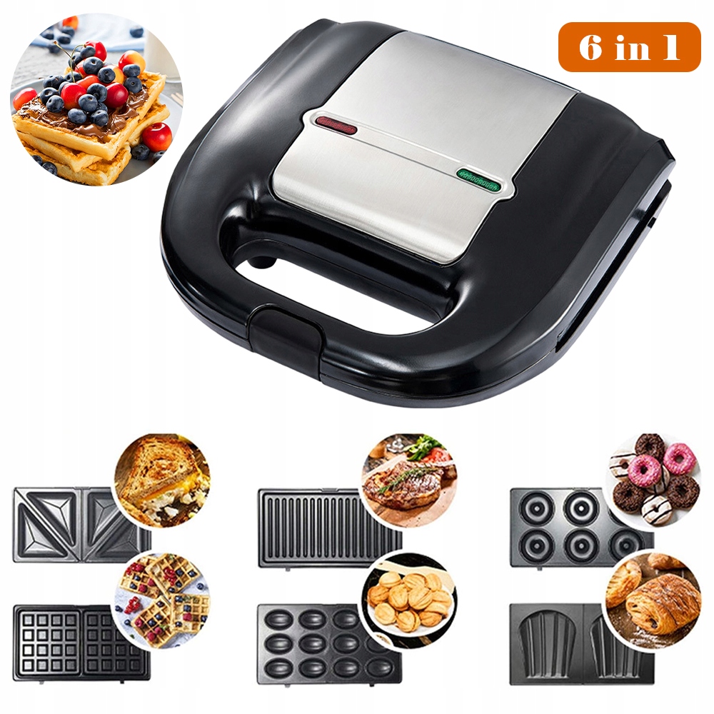 багатофункціональна машина для сніданку 6 в 1 відключена і має 6 типів випічки, які ідеально підходять для персоналізації різних смачних страв. Легко зробити смачні пончики, вафлі, бутерброди, горіхові торти, стейк та торт.