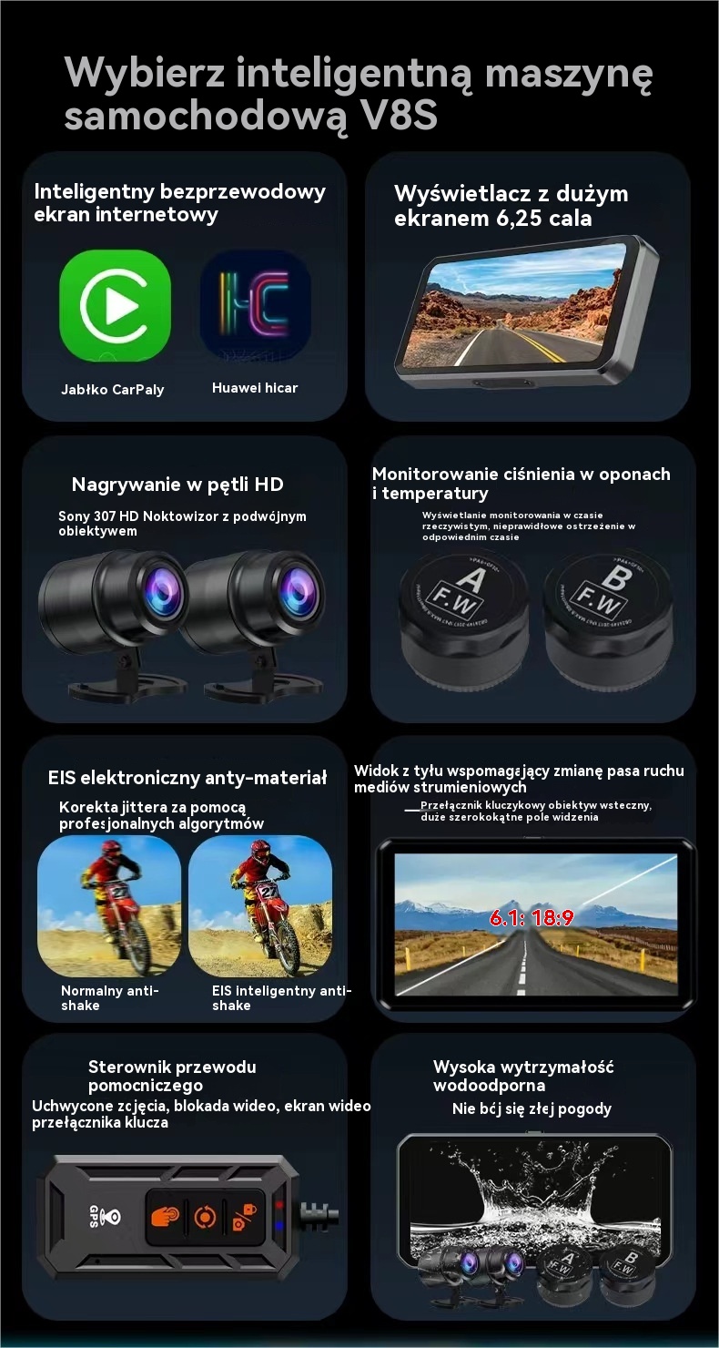 Бездротова машина високої чіткості CarPlay, Android Auto, GPS-навігація, система контролю тиску в шинах Ознайомлення з продуктом Це багатофункціональна інтелектуальна автомобільна машина, розроблена для мотоциклів, яка об’єднує записи водіння високої чіткості, бездротову функцію CarPlay, Android Auto, GPS-навігацію, моніторинг тиску в шинах (TPMS) та інші функції. Він використовує передову технологію для забезпечення запису відео високої чіткості, інтелектуального підключення, навігації в реальному часі та забезпечення безпеки, що робить його ідеальним вибором для любителів їзди на мотоциклі.