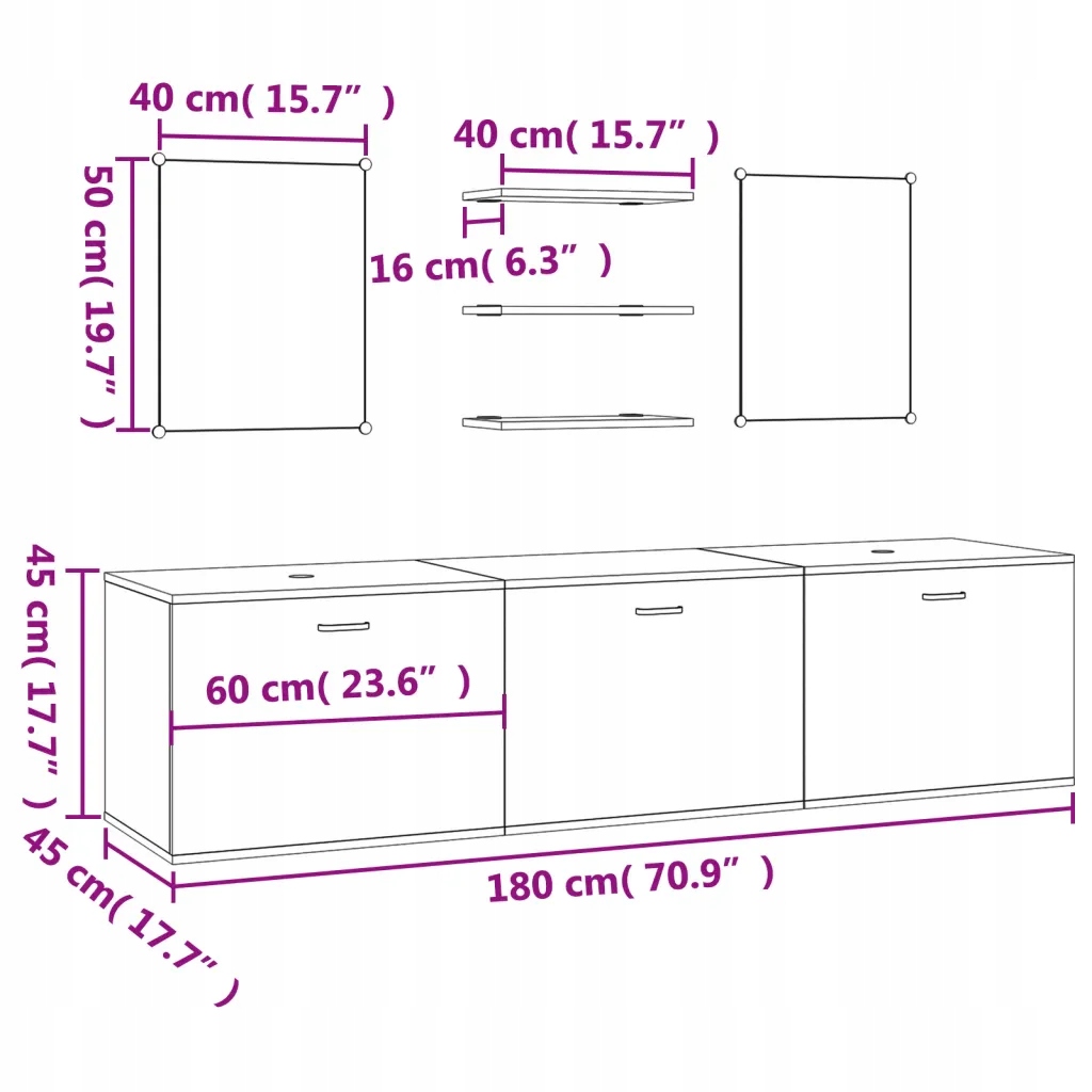 - Розміри шафи під раковиною: 180 х 45 х 45 см (довжина X ширина х висота)