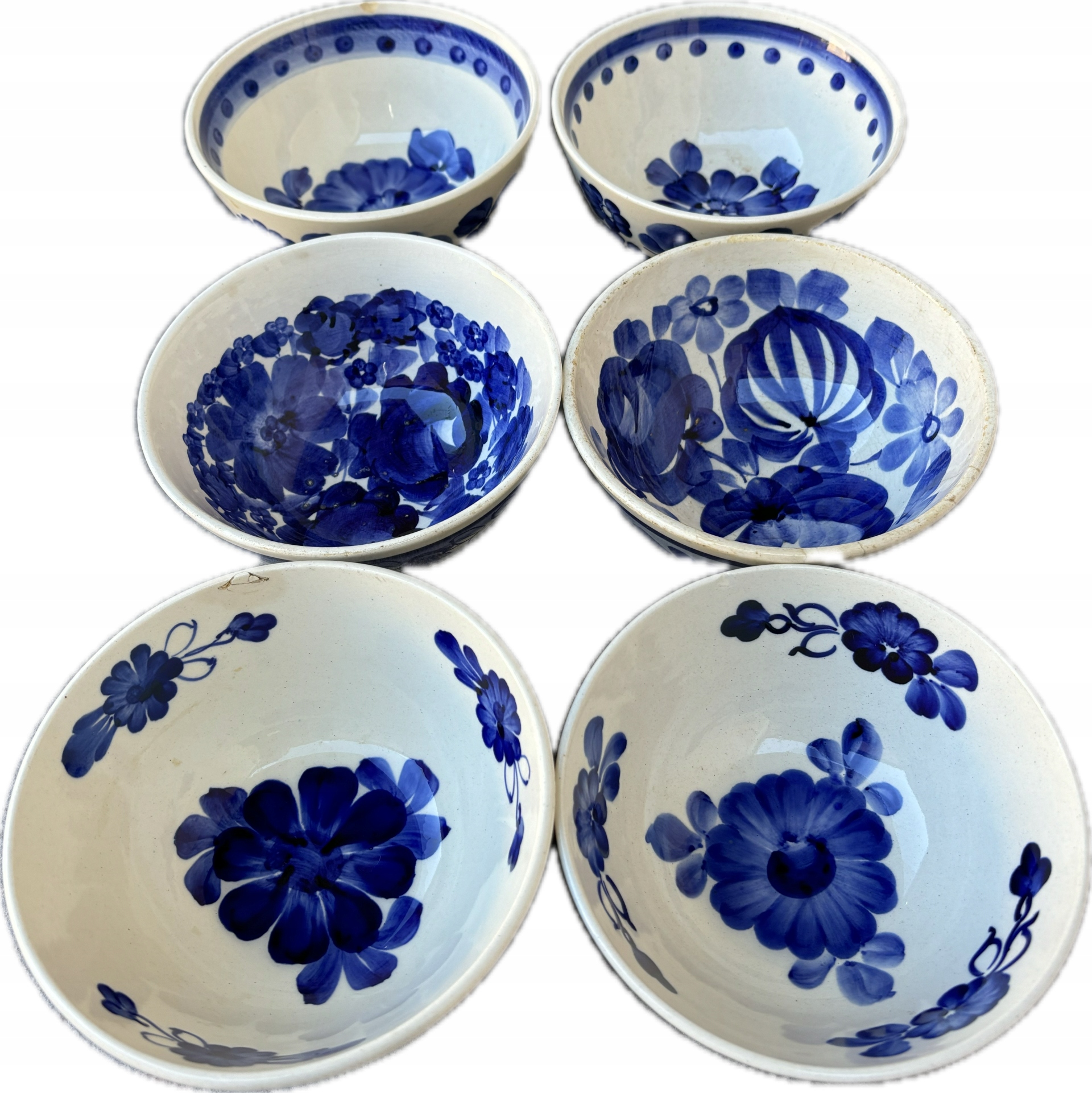 6 фаянсових мисок із Влоцлавека 1970-1980-х років. Підписано. Ручний розпис. Розміри; висота 6 см х 14. Незначні сліди використання, незначні виробничі дефекти глазурі, невеликі зміни кольору на краю. Стан стаканчиків та схема фарбування на фото.