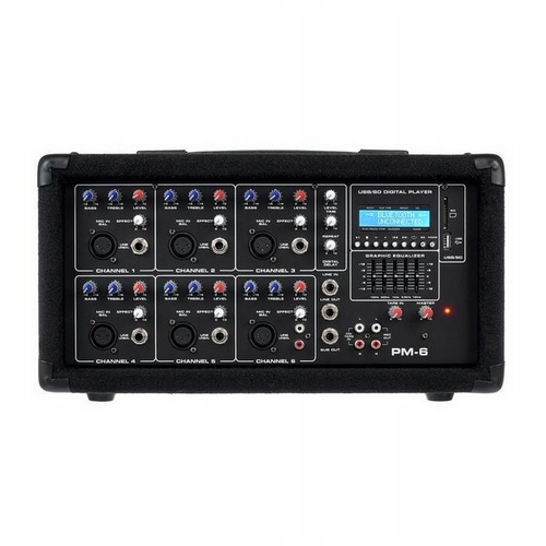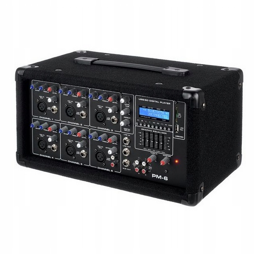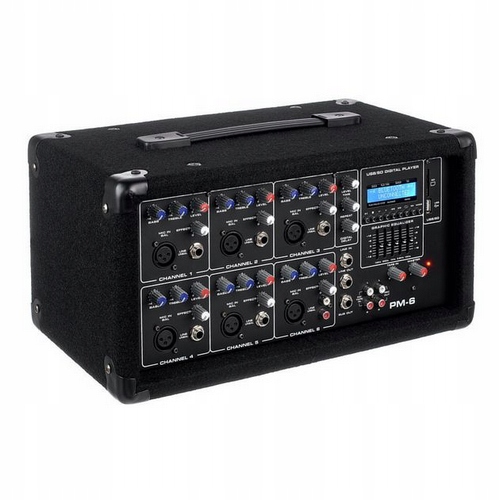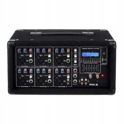 Fun Generation PM-6 — це компактний і універсальний 6-канальний потужний мікшер з 2 x 80 Вт при 4 Ом. Пристрій ідеально підходить для невеликих репетиційних залів, шкіл або сольних виступів. Оснащений MP3-плеєром (USB/SD) і модулем Bluetooth, він забезпечує бездротову передачу музики. Користувач має в своєму розпорядженні 6 мікрофонних і лінійних входів з 2-смуговою корекцією тону (EQ) на кожному каналі і графічним еквалайзером в головній секції. Додатковою перевагою є цифрова затримка з регулюванням часу та повторення, яка додає глибини звуку.
