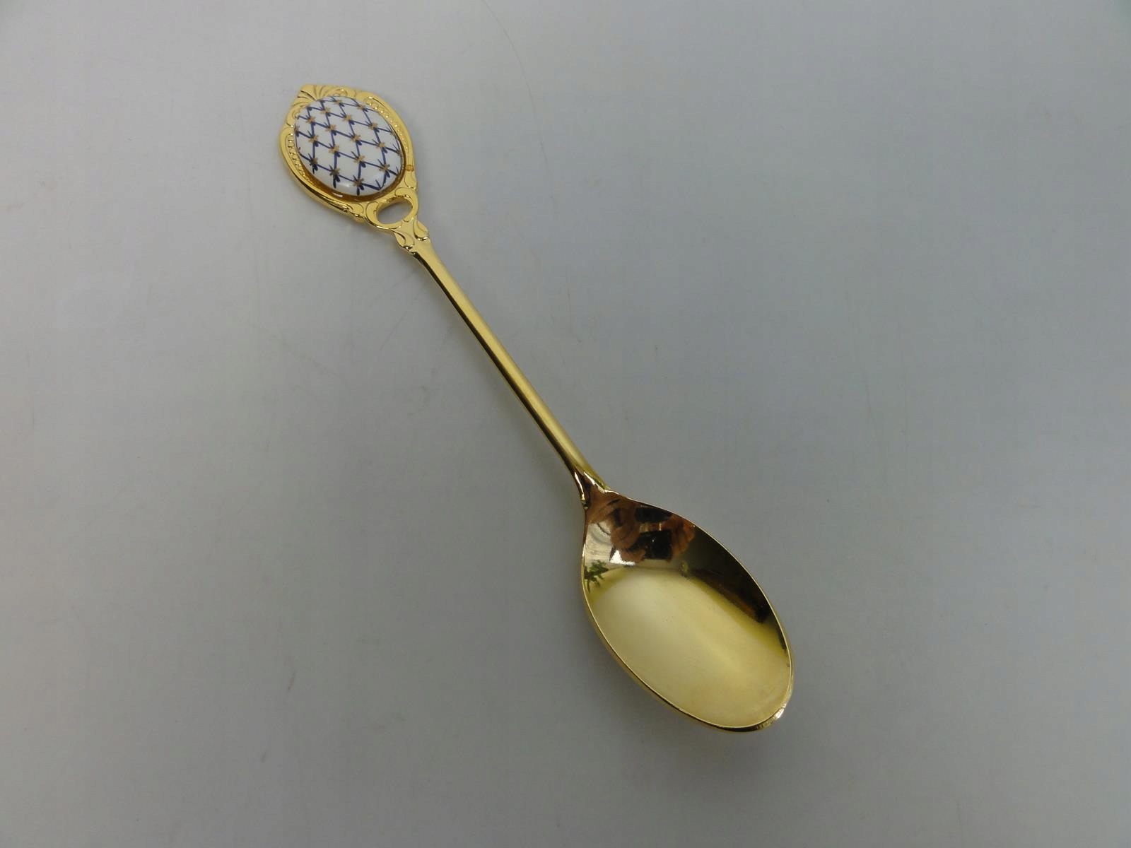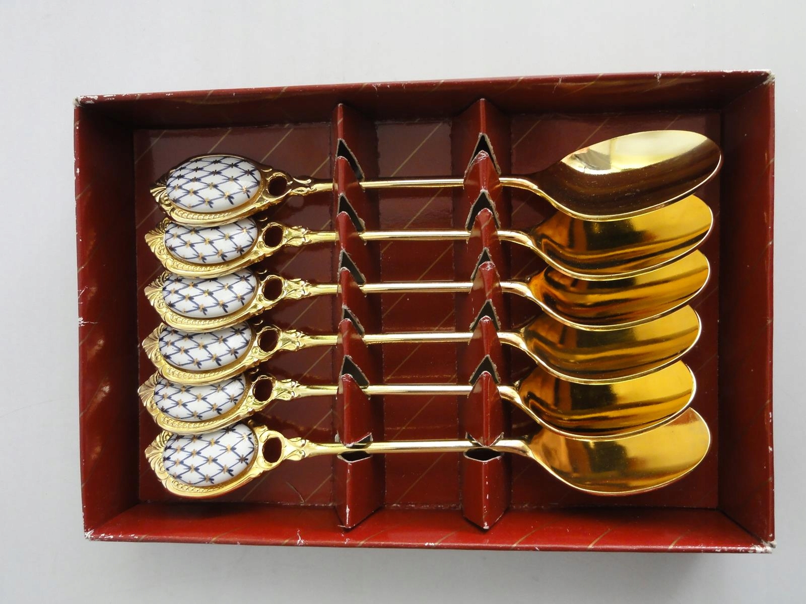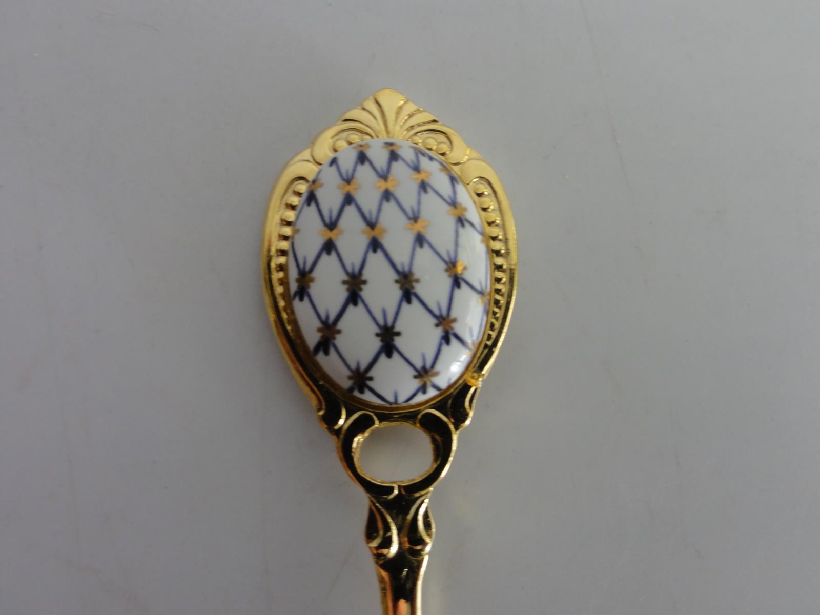 *ложки з позолоченої нержавіючої сталі, з порцеляновим медальйоном, розписаним візерунком, що нагадує синю кобальтову сітку,