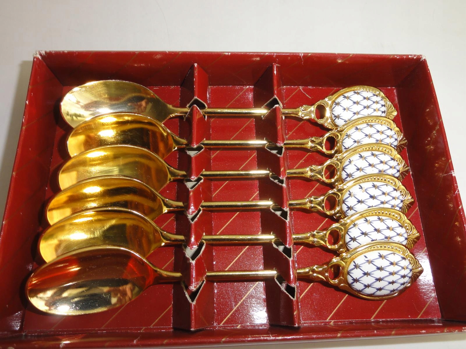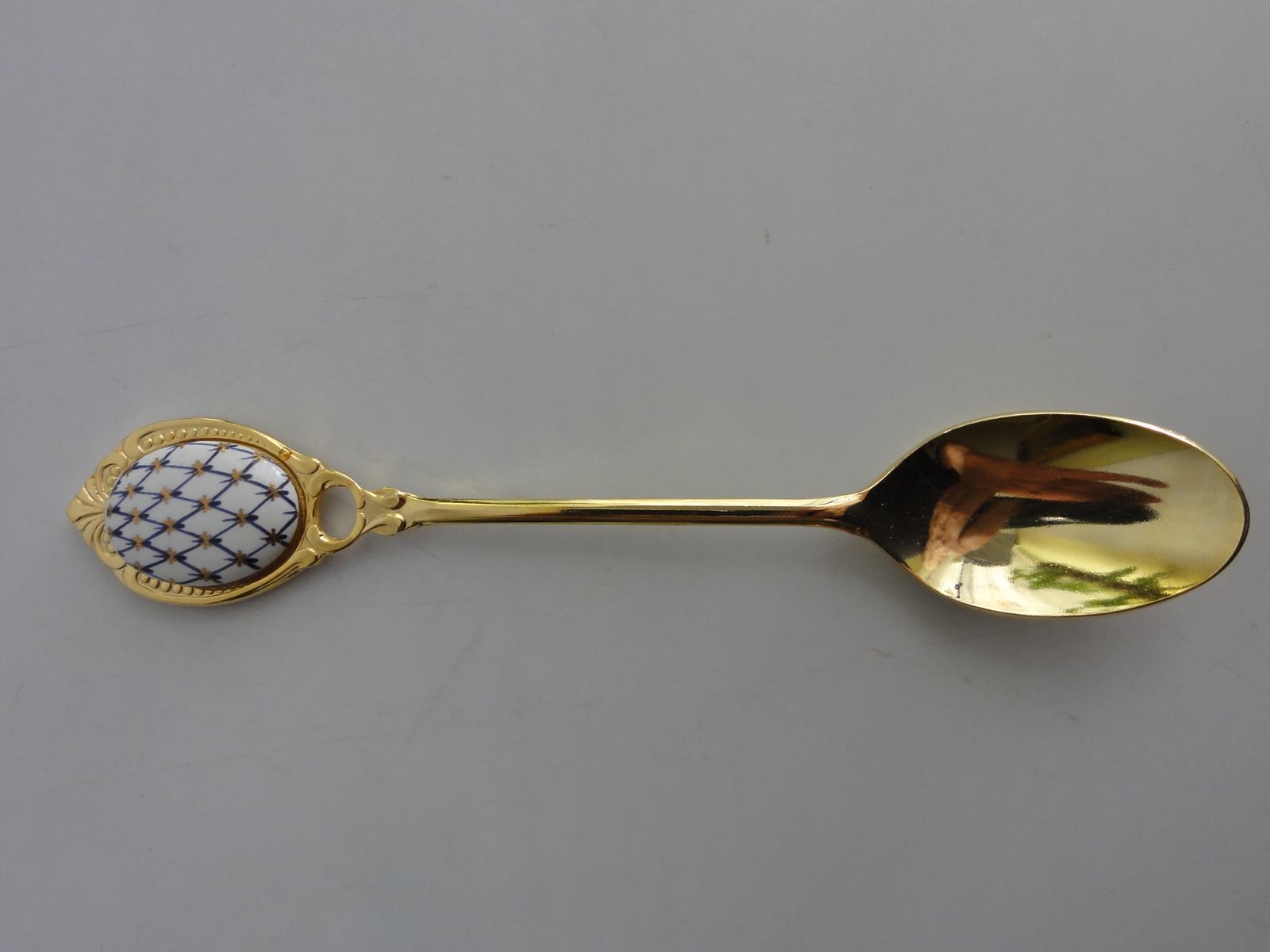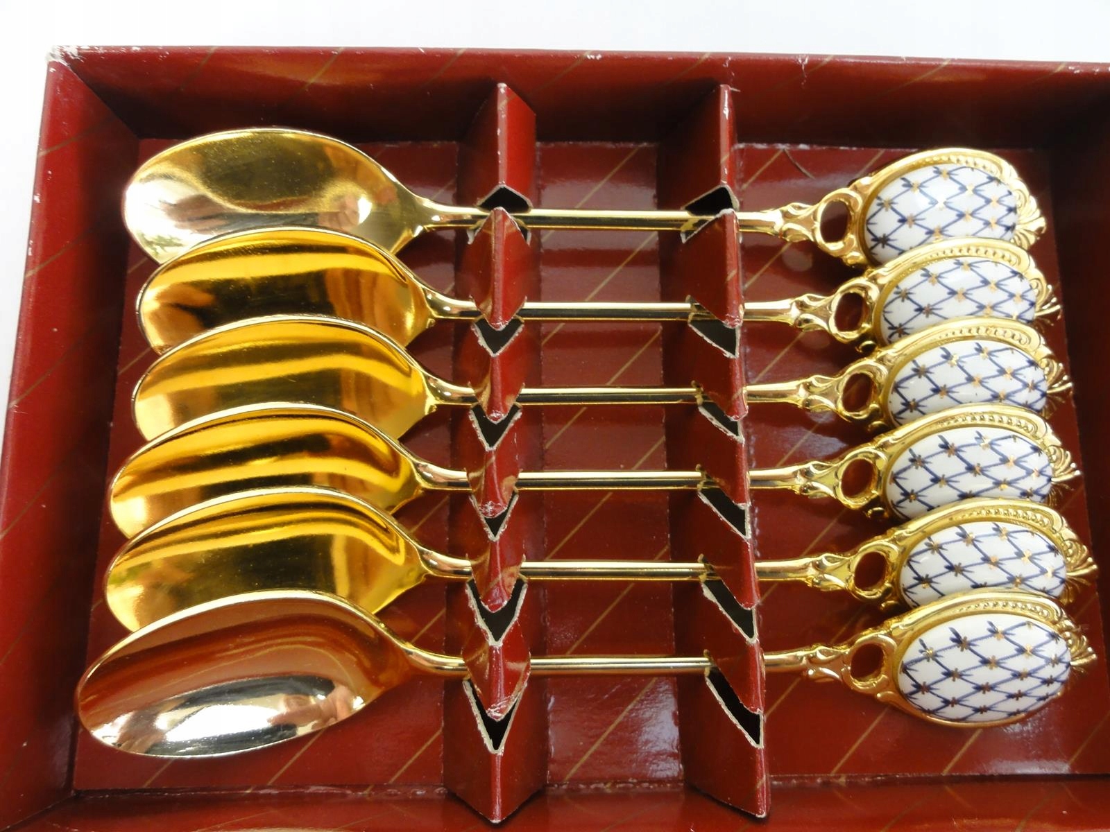 *ложки з позолоченої нержавіючої сталі, з порцеляновим медальйоном, розписаним візерунком, що нагадує синю кобальтову сітку,