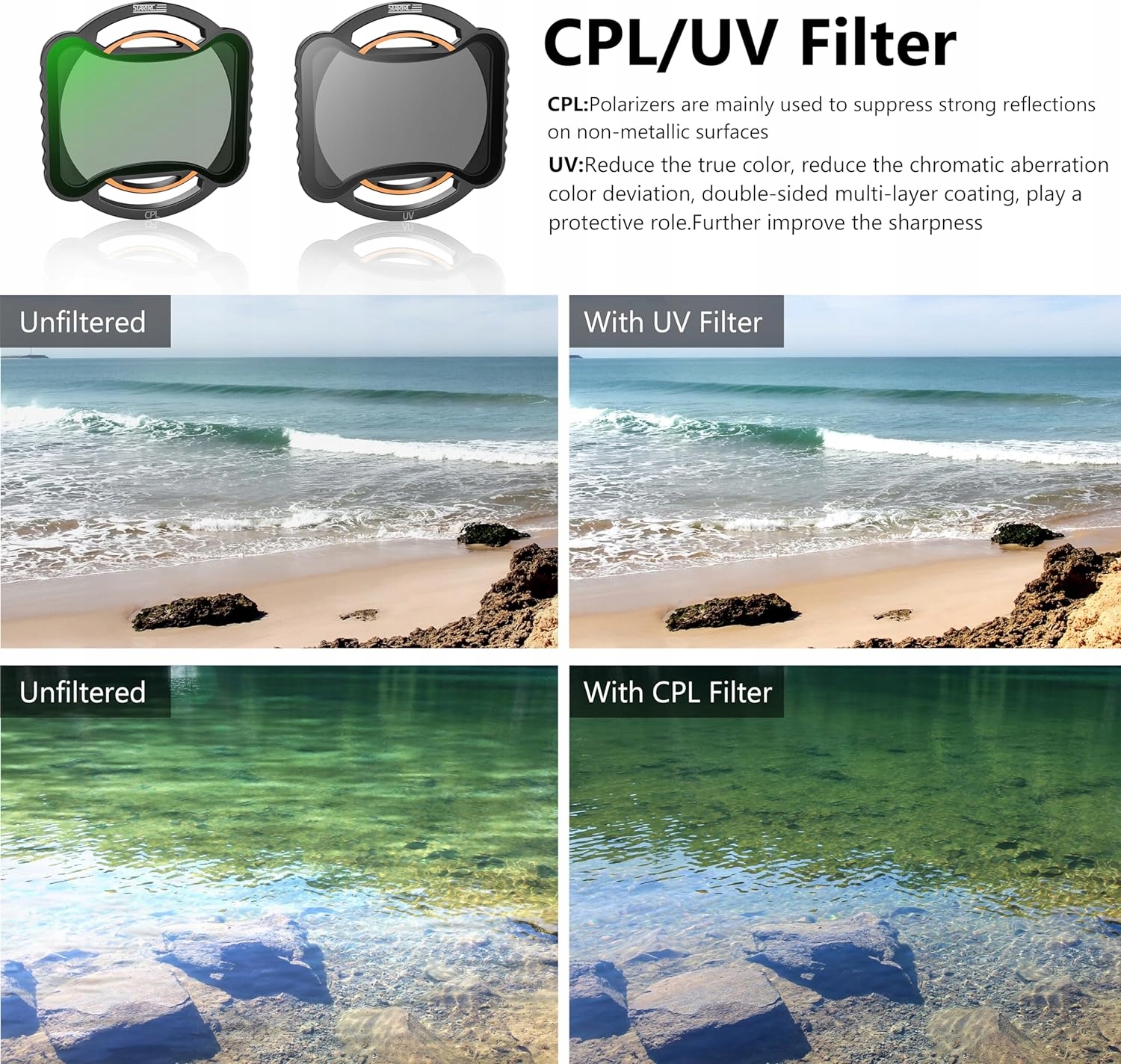 Підвищте насиченість кольорів: додайте яскравих кольорів до своїх аерофотозйомок за допомогою фільтра CPL, який входить у комплект. Зменшуючи відблиски та небажані відблиски від поверхонь, таких як вода та скло, цей фільтр збагачує кольори та покращує чіткість, завдяки чому ваші знімки виділяються яскравими деталями.