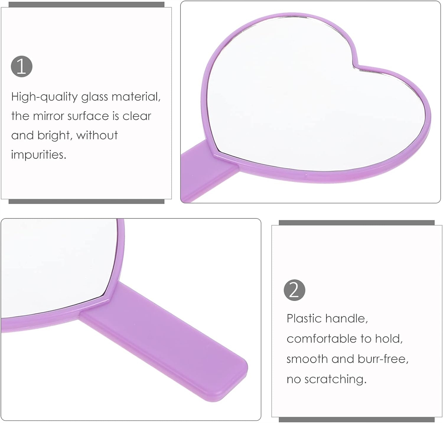 Переносне косметичне дзеркало сподобається всім, хто любить красу та особисту гігієну, особливо тим, хто більшу частину дня проводить поза домом. Косметичне дзеркало з ручкою, надсилаючи його в подарунок дівчатам, жінкам і професійним візажистам, може стати сюрпризом. Туалетний столик прозора дзеркальна поверхня з високою роздільною здатністю. Практичний і вишуканий дизайн. Дзеркало для макіяжу у формі серця, зручне та легке. Воно не буде надто громіздким як для домашнього використання, так і для подорожей як компактне дзеркало. Дорожнє дзеркало для макіяжу в 2 кольорах для підлітків, дівчат, жінок, сестер, жінок на день народження чи свято.