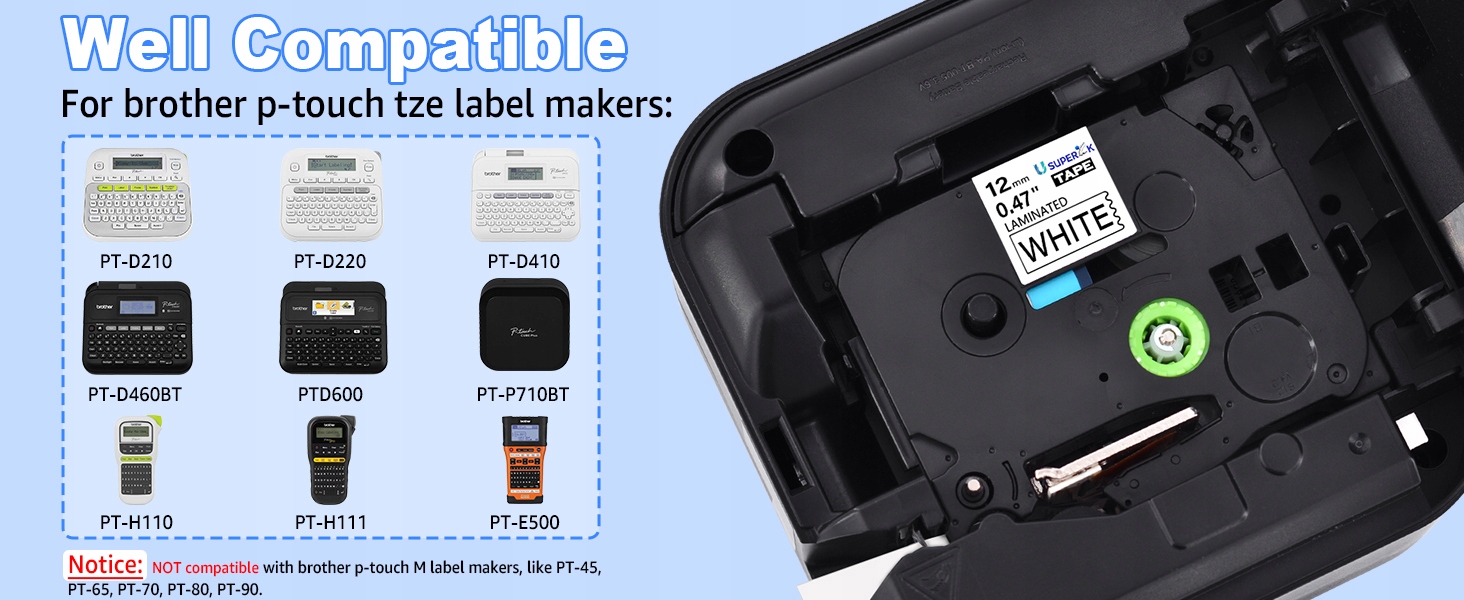- 【Інформація про продукт】: Заміна ламінованої стрічки TZE-231 TZ231 TZE 231. Колір: Чорний текст на білій стрічці. Ширина: 0,47 дюйма (12 мм), довжина: 26,2 футів (8 м). Після видалення етикетки немає липких залишків. Друк проходить безперебійно, без варення, а текст чіткий і простий у читанні. Зроби тощо. Швидко організовуйте роботу або додому. D400AD, PT-D600, PT-P710BT, PT-P700, PT-H100, PT-D400VP, PT-D450, PT-D600VP, PT-P750W, PT-P300BT та інші.
