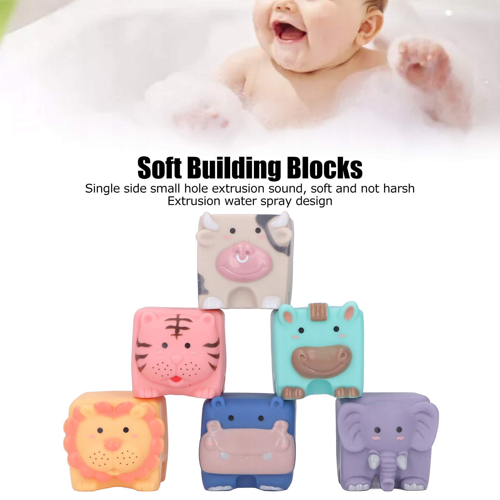 Функція: 1. Потік водяного потоку: м'які блоки також можуть використовуватися як іграшки для ванни для дітей, пливуть по воді, видавлюючи потік води, один видавлений звук з невеликого отвору, привертаючи увагу дитини.