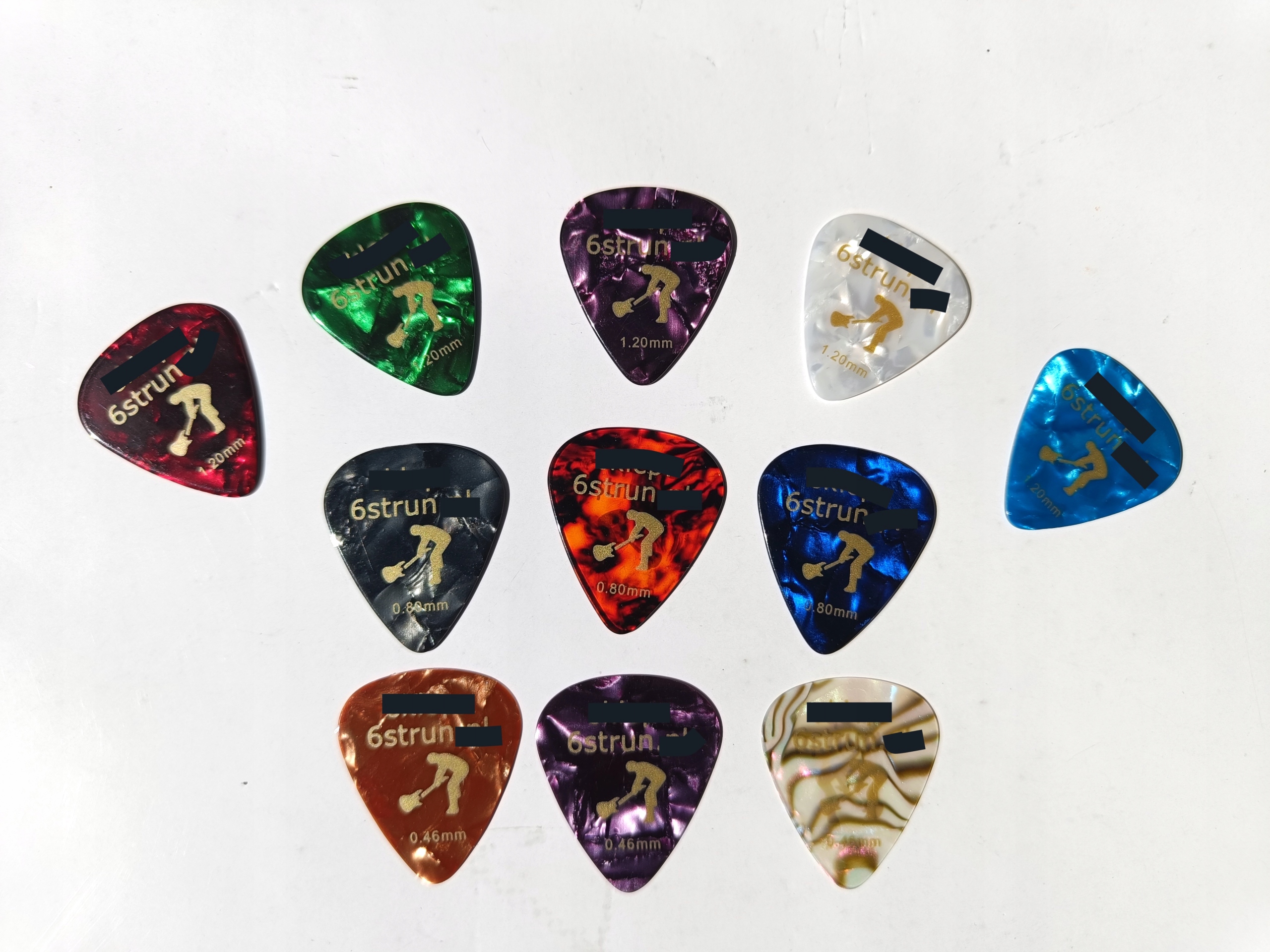 набір з 6 кубиків гітари + коробка голеностопа. Реверси міцно виготовлені, гладкі, добре лежать у руці і добре мерехтіють, з оригінальним логотипом. Будь ласка, надайте кольори та товщини щиколоток у повідомленні під час покупки, або ми надішлемо випадковим чином.