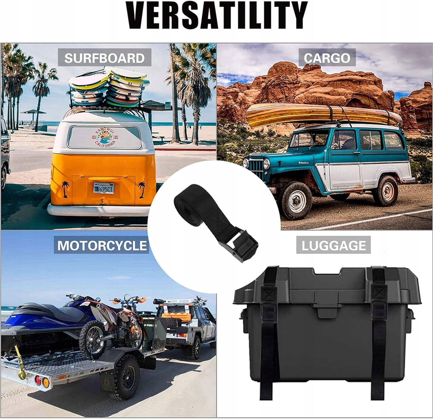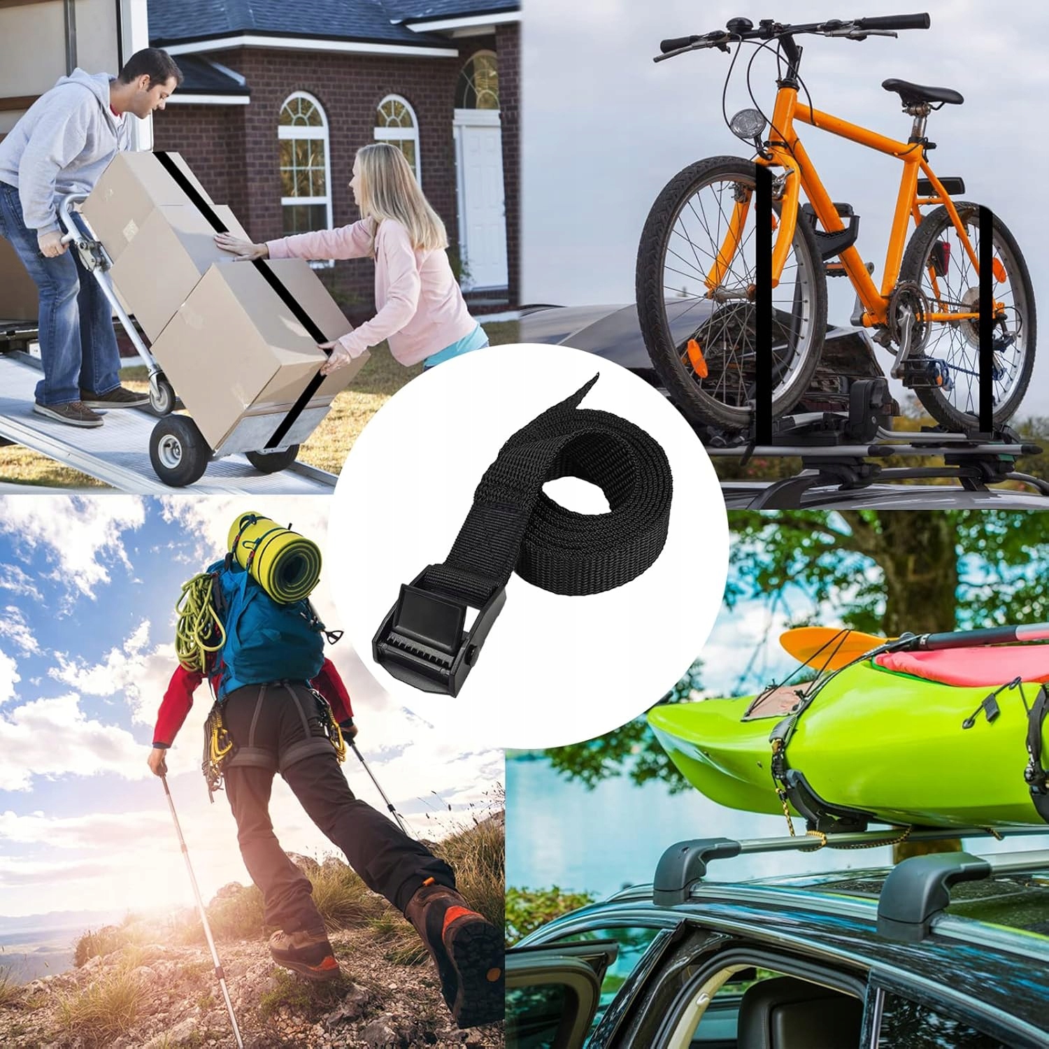 Ремінь для кріплення — це інструмент для кріплення валіз, вантажів і мотоциклів, а також також можна використовувати під час кемпінгу та занять спортом у кемпінгу. Його можна використовувати замість стрейч-фольги, що економічно та екологічно.