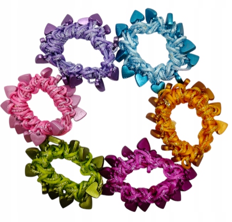 - Набір складається з 6 плетених гумки в шести кольорах: синій, світло -рожевий, темно -рожевий, фіолетовий, зелений та помаранчевий. Кожна гумка має декоративне застосування у вигляді сердець.