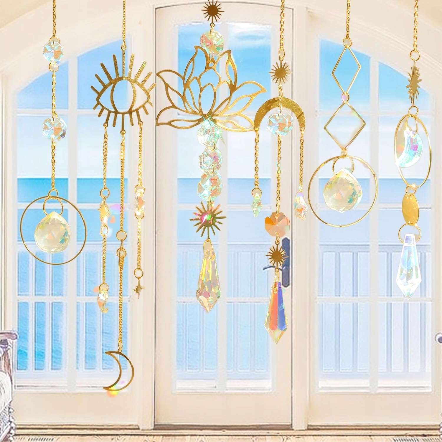 Набір із 6 елегантних кришталевих сонцезахисників золотого кольору. Кожен елемент відбиває світло, створюючи прекрасні райдужні відблиски, які прикрашають інтер’єри та екстер’єри. Виготовлені з високоякісного кришталю та металу, вони ідеально підходять до вікон, садів, люстр, балконів та рослин. Ідеальний спосіб додати магії, блиску та елегантності будь-якому місцю.