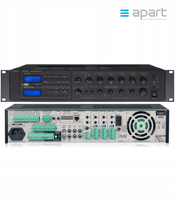 Підсилювач MA247MR додатково оснащений тюнером AM/FM , MP3-аудіоплеєр, USB-вхід і SDдля покращення взаємодії з користувачем без необхідності підключати нове обладнання.