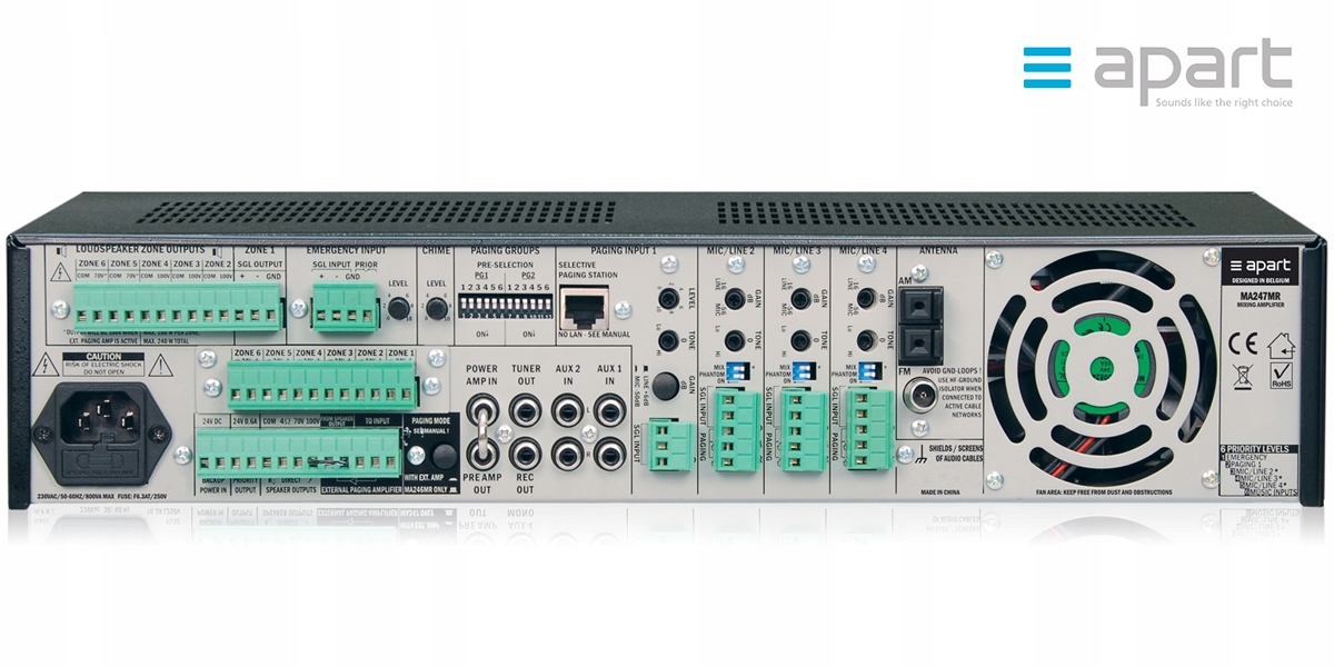 MA247MR має 1 незалежна зона, що дозволяє використовувати зовнішній підсилювач потужності - корисно в установках з великою кількістю гучномовців, де багато енергії b> потрібен. Зони 5 і 6 мають виходи 70 В з можливістю підключення динаміків 100 В.