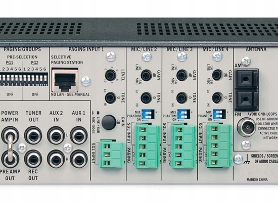 Підсилювач мікшування маєчотири симетричних входу з роз'ємом Euroblock і мікрофонний вхід № 1, оптимізований для Apart MICPAT-6 – 6-зонний, селективний пейджинговий мікрофон. Мікрофон Apart відтворює головну роль, і додатково ви можете підключити до 5 інших мікрофонів, використовуючи один мікрофонний вхід на підсилювачі.
